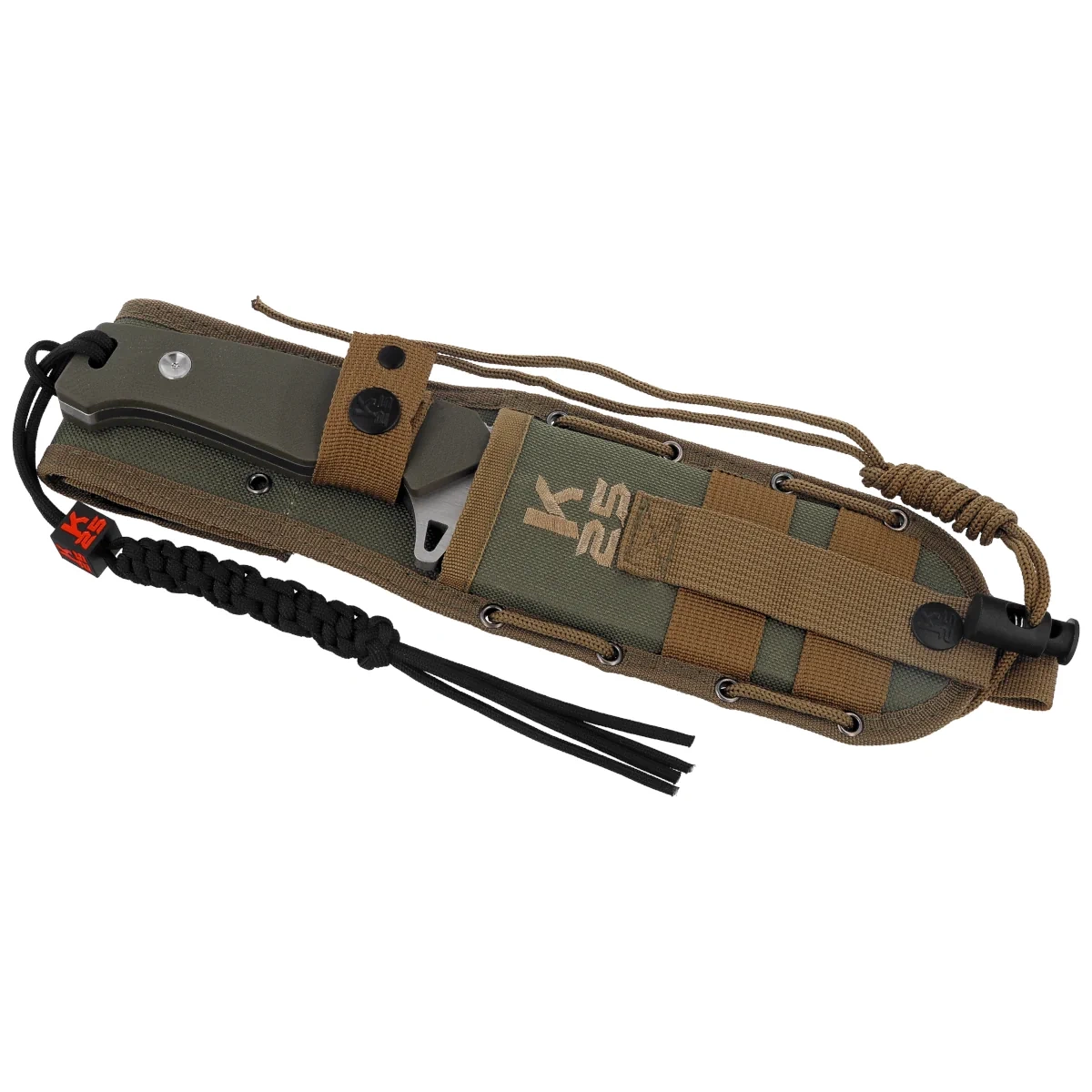 - K25 Bravo Green G10, Satin/Brushed, tactical knife with a fixed Blade and full tang construction in 7Cr17MoV steel, equipped with a G10 composite handle. Nylon sheath with M.O.L.L.E. standard attachment. A solid partner for field and EDC applications.