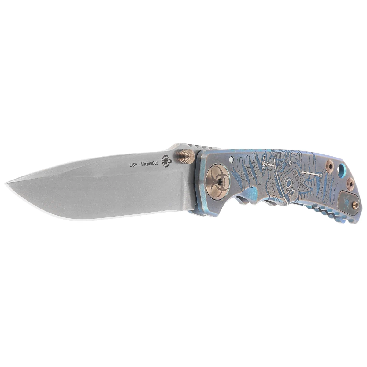 The solid titanium handle is decorated with artistic engraving, depicting the theme of Doctor Plague. The whole is complemented by bronze anodized details, which contrast strikingly with the green hue of the Handle. Thanks to the properly contoured handle, the knife sits securely in the hand, ensuring precision when performing a variety of activities. The robust frame lock mechanism guarantees safe use even in extreme conditions. Each piece is handmade in the USA, making it a valuable and sought-after item among both collectors and discerning users.
