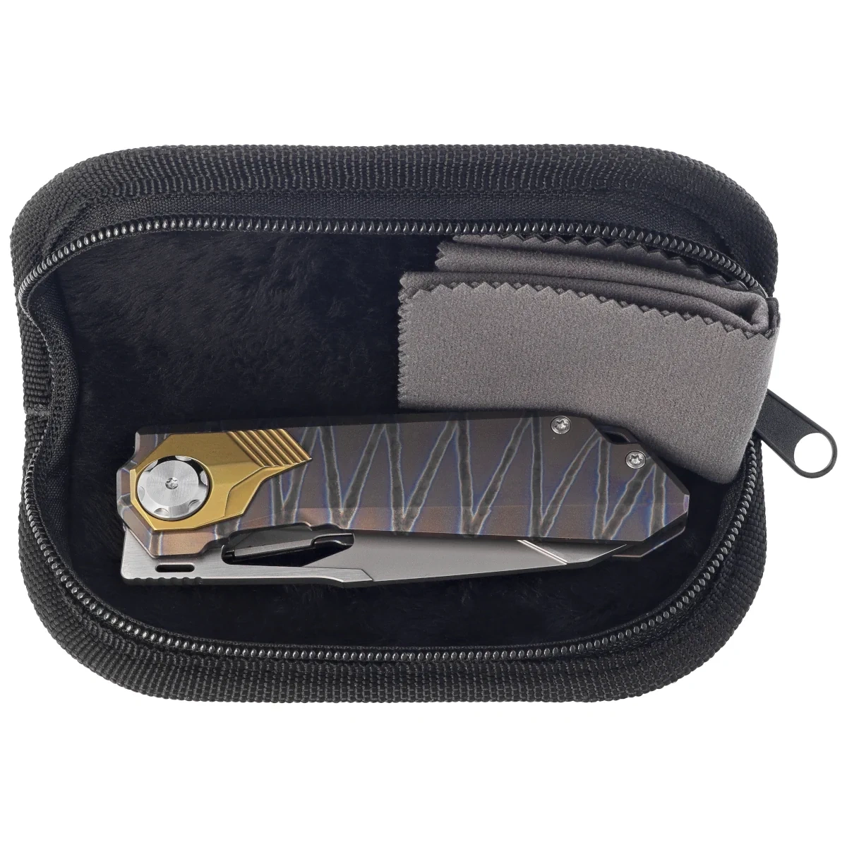 Handle - thick pieces of heat-dyed Lightning Storm patterned titanium 6AL4V, beautifully milled using CNC machine tools. The titanium backspacer to which the grips are attached guarantees the rigidity and strength of the entire construction. The simplicity and solidity of the construction give the assurance of many years of use. Single-position clip (right), made of titanium, allows carrying the knife in tip-up position . The pivot with Button Liner Lock button is decorated with overlays of bronze-dyed titanium. On the other side, a slider for additional protection against accidental opening or folding of the knife. In the protruding part of the backspacer you will find a place to thread a safety or decorative cord.