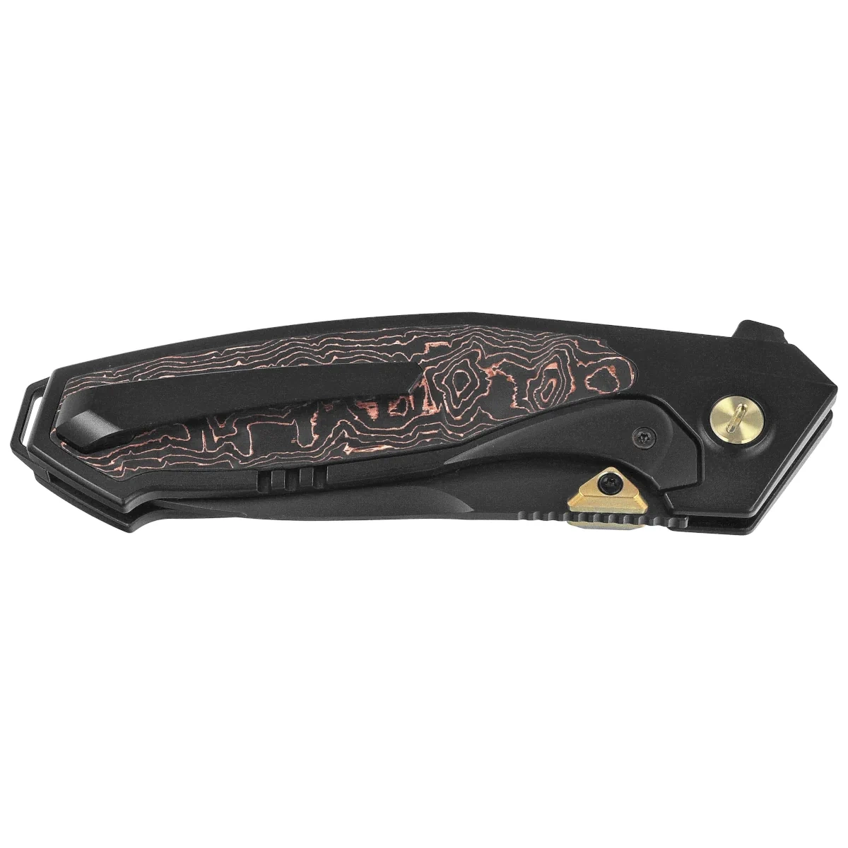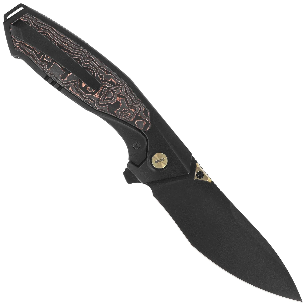 • Kingfisher Black Titanium/Copper Carbon Fiber, Black DLC - a modern premium EDC folding knife with a hand-ground Böhler M390 steel Blade and Titanium Handle with carbon fiber inlay. Precision, style and durability in a compact EDC folder.