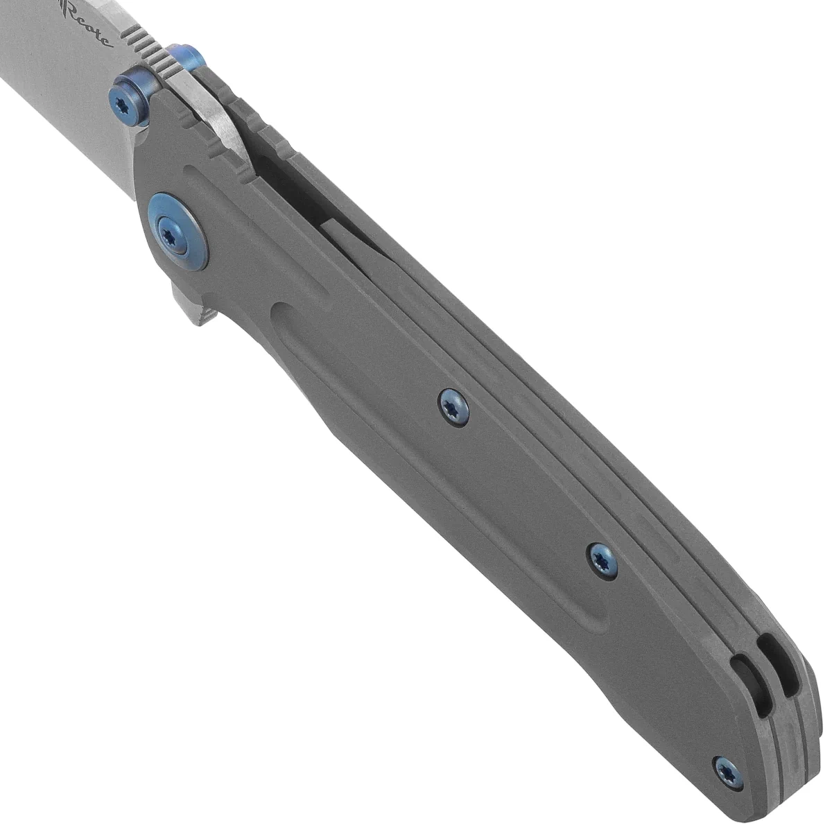 Handle - titanium, finished by Dark Bead Blasted method, guarantees stiffness, lightness and high wear resistance. Milled finger undercuts and beveled edges improve ergonomics, while the titanium backspacer reinforces the structure and allows for line attachment. A deep-carry clip allows for discreet carrying, and a frame lock with steel inlay ensures safe use. Accents in the form of blue anodized screws and pivot highlight the futuristic nature of the design and distinguish this model from other tactical knives.