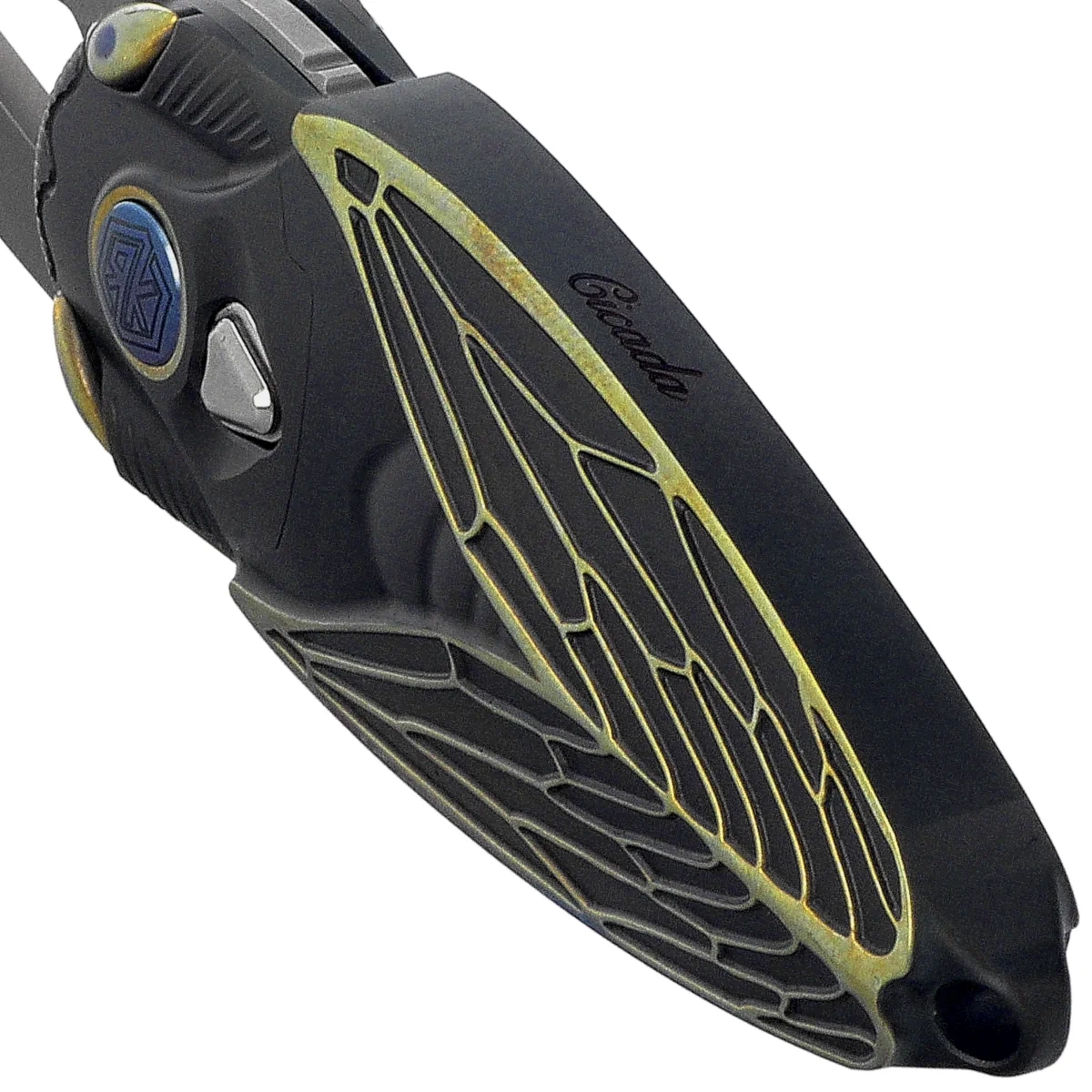 - Cicada-DG Dark Gray / Gold Titanium, Bead Blasted - a modern premium folding knife from Rike Knife, with an M390 steel blade and milled titanium handle. Biomechanical form, collectible character and technical precision in one design.
