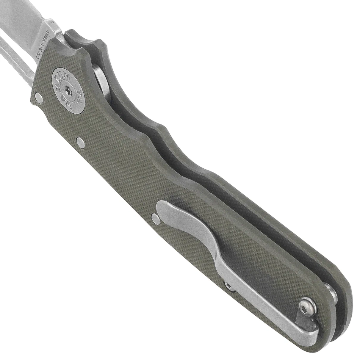Handle grips - G10 grips offer durability and low weight, while their textured surface and beveled edges improve grip and comfort. Ergonomic finger cutouts support blade control during precision tasks. The model is equipped with a deep-carry clip, allowing discreet tip-up carry on the left or right side. Internal steel liners reinforce the overall design, and the open back design with spacer sleeves makes it easy to keep clean. This is a practical yet sophisticated tool for the most demanding EDC knife users.