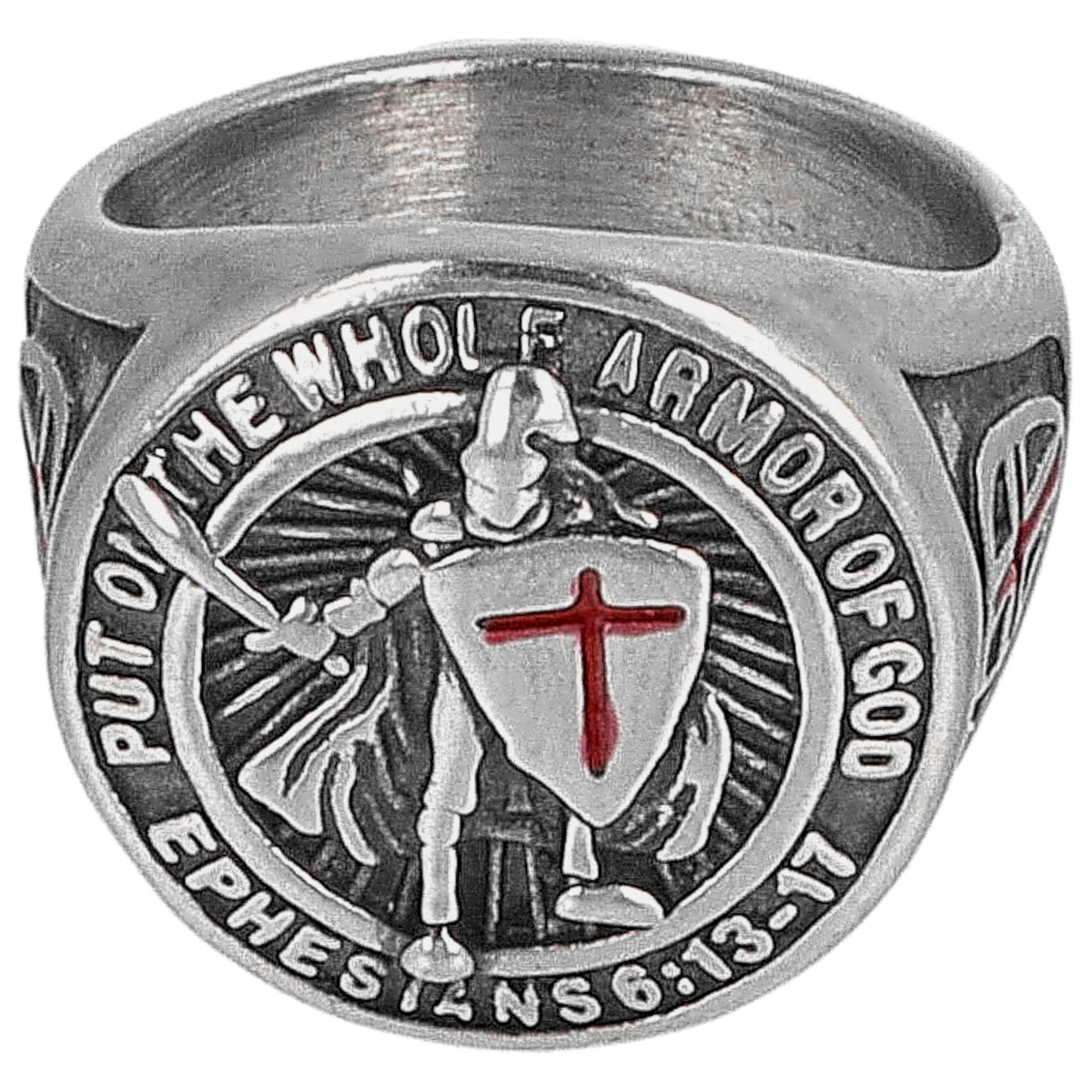 - Tole 10 Imperial Templar Ø20 ring (16250-20) - a massive Templar signet ring with a red cross and a quote about the “armor of God”. Enameled details, steel surface, medieval symbolism.