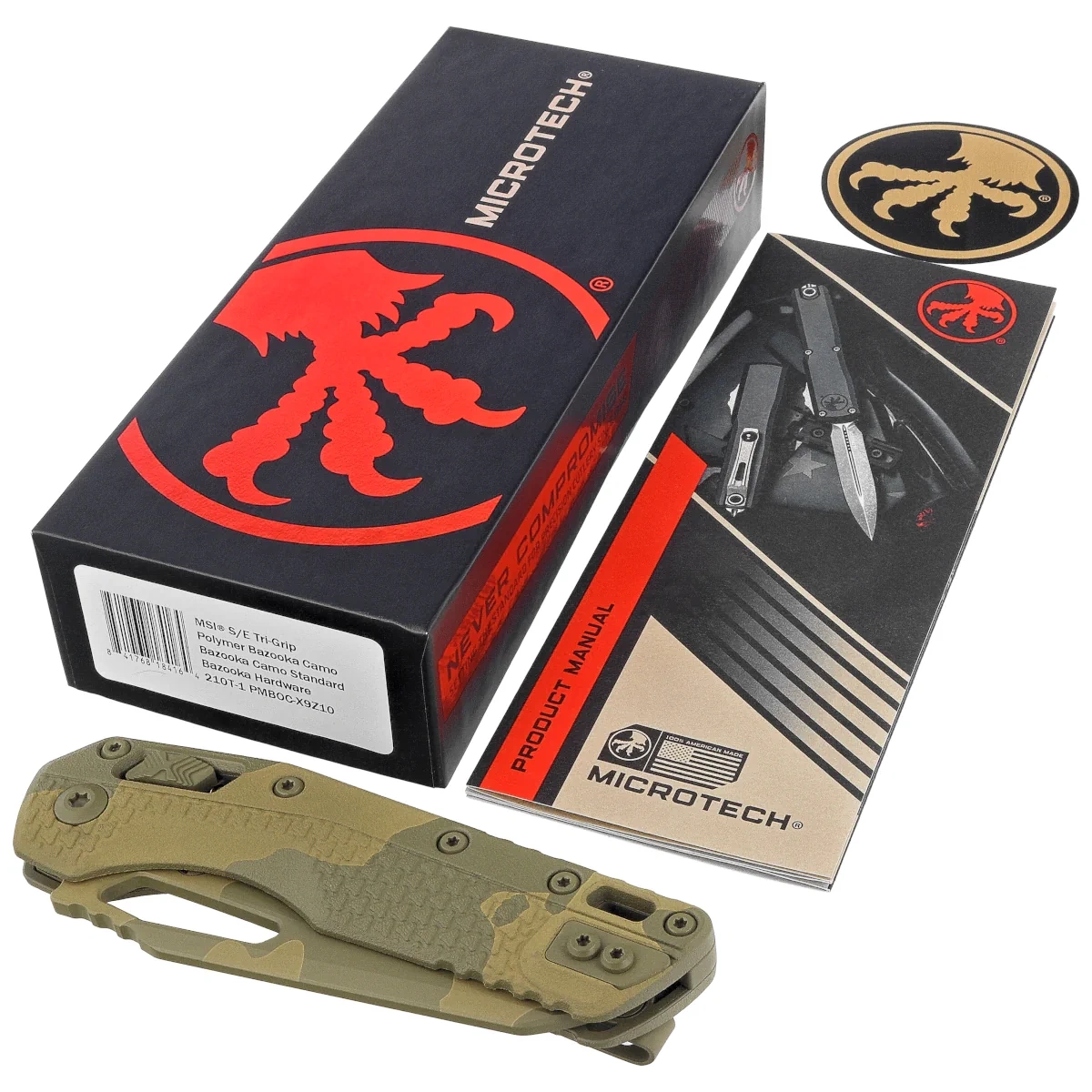 MSI S/E Ram-Lok Bazooka Camo Green Tri-Grip Polymer, Cerakote Camo folding knife that combines strength, durability and elegance. Its blade is made of excellent M390MK steel, which is the result of cooperation between two renowned companies - Microtech and Böhler. This steel is known for its exceptional strength and long sharpness retention, making this knife unafraid of any challenge. The intuitive RAM-Lok ensures safety during use. This innovative lock is easy to operate and provides ease of use for both right and left-handed people. The Handle of the knife is made of polymer, durable and ergonomic. Its shape is designed to fit perfectly in the hand, ensuring comfort even during prolonged use. This knife is not only a tool, but also a work of applied art. Its designer, Anthony Marfione, founder and owner of Microtech, has taken care of every detail. From the elegant black finish to the satin details, this knife is both beautiful and practical. Whether you're looking for a reliable tool or an elegant accessory, MSI (Microtech Standard Issue) knife will meet your needs.