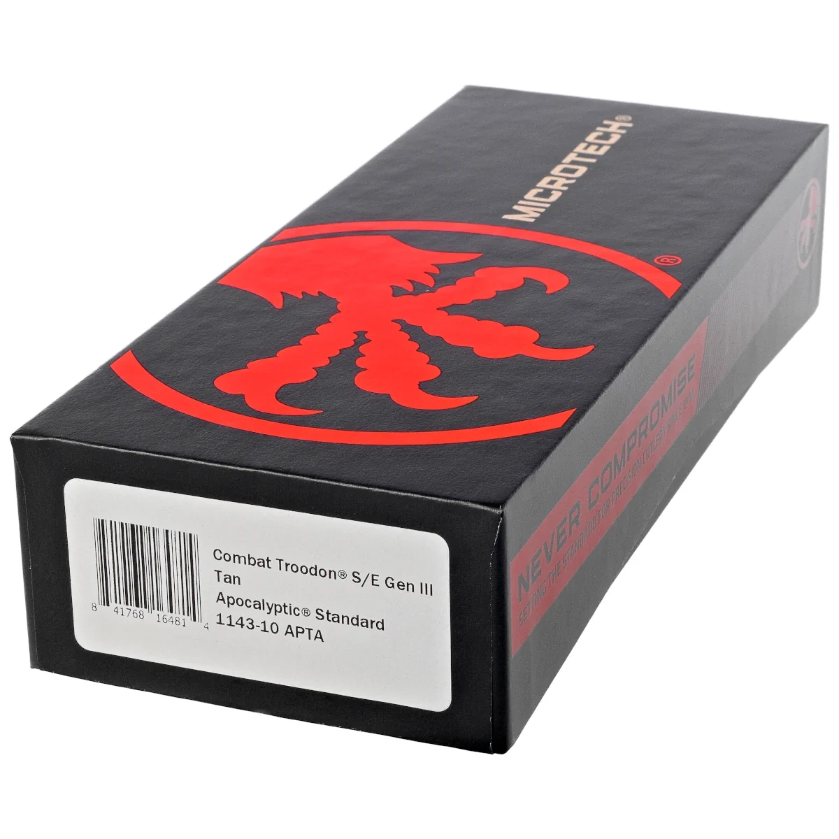 Combat Troodon Gen III S/E Tan Aluminum, Apocalyptic this largest of the automatic knives is the pinnacle of precision engineering and tactical prowess in the field of OTF (Out The Front) knives. Built for a wide range of utility applications, it boasts a 25% larger size compared to the flagship Troodon. Precisely crafted, it features a sophisticated and hellishly fast mechanism that extends the razor-sharp blade. 100% made and assembled in the USA. Designed by Anthony Marfione, knifemaker and owner of Microtech Knives.