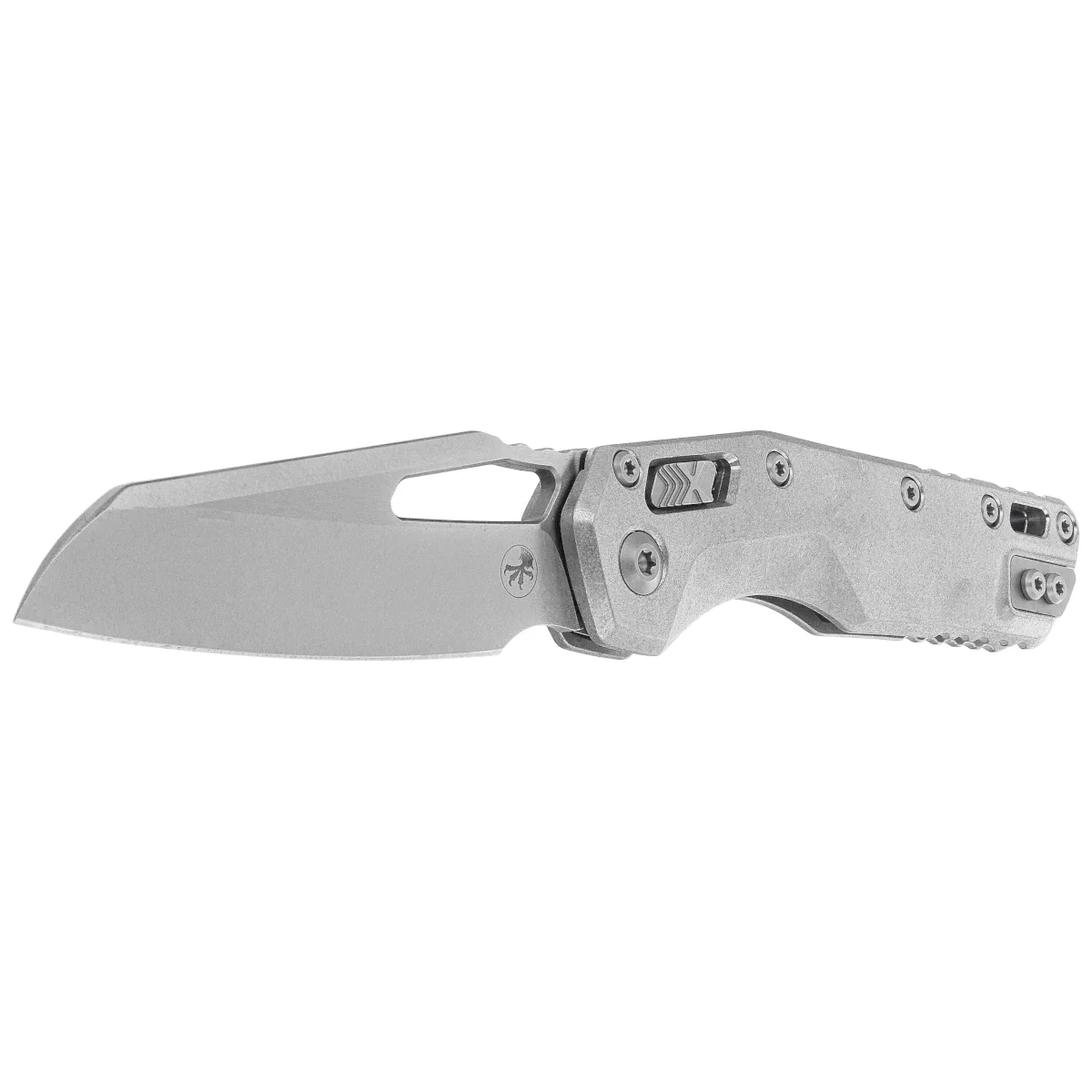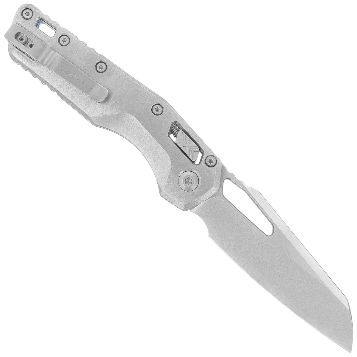 Handle - made of durable titanium, Stonewashed finish for better grip . Wide locking slide with Microtech's characteristic stepped X structure . Both grips are bolted together with a solid titanium backspacer in bronze. A double-sided (right/left) titanium clip allows the knife to be carried discreetly in tip-up position. Above the clip a lanyard hole, a place for a safety or decorative cord.