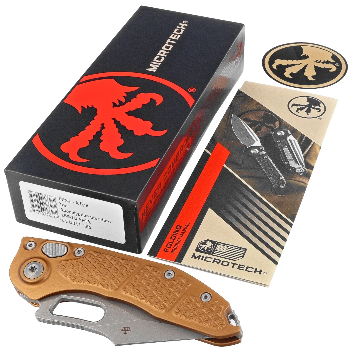 - Stitch-A S/E Tan Aluminum, Apocalyptic automatic version of the popular design by Sebastijan Berenjie of Borka Blades and Microtech. Wide harpoon-shaped blade, superior materials and legendary Microtech workmanship!