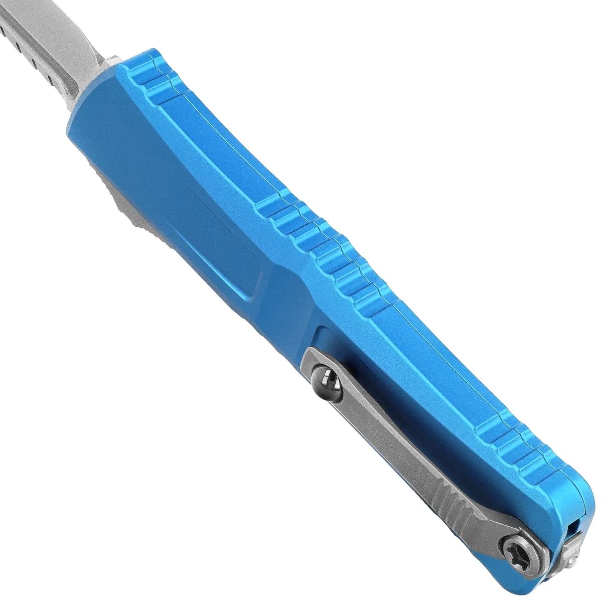 Combat Troodon Interceptor Gen III Signature Blue Aluminum, Stonewashed this largest of automatic knives is the pinnacle of precision engineering and tactical prowess in the field of OTF (Out The Front) knives. Built for a wide range of utility applications, it boasts a 25% larger size compared to the flagship Troodon. Precisely crafted with a sophisticated and hellishly fast ejection mechanism for the razor-sharp new type of blade - the Interceptor. 100% made and assembled in the USA. Designed by Anthony Marfione, knifemaker and owner of Microtech Knives.