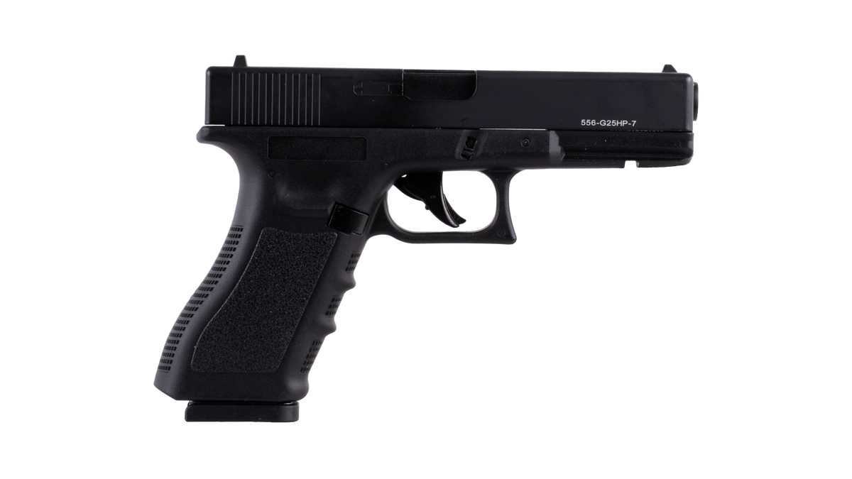 • Niksan Defense NKS GL17, CO2-powered BB air pistol, a faithful replica of the Glock 17. This model features a metal slide with a blowback system that realistically simulates the operation of a real firearm. Black finish.