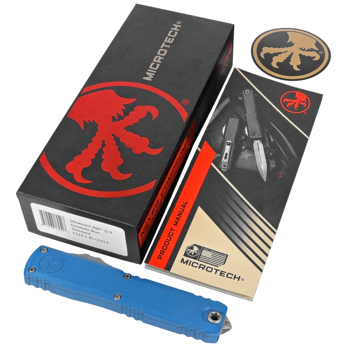 - Ultratech Gen 3 ZBP D/E Cerakote Blue Aluminum, Cerakote Blue is an upgraded version of Microtech's iconic knife: new glass striker, Crud Kutter system, Dual-Fuel Drive Train and Zero Blade Play™ - no blade play when unfolded.