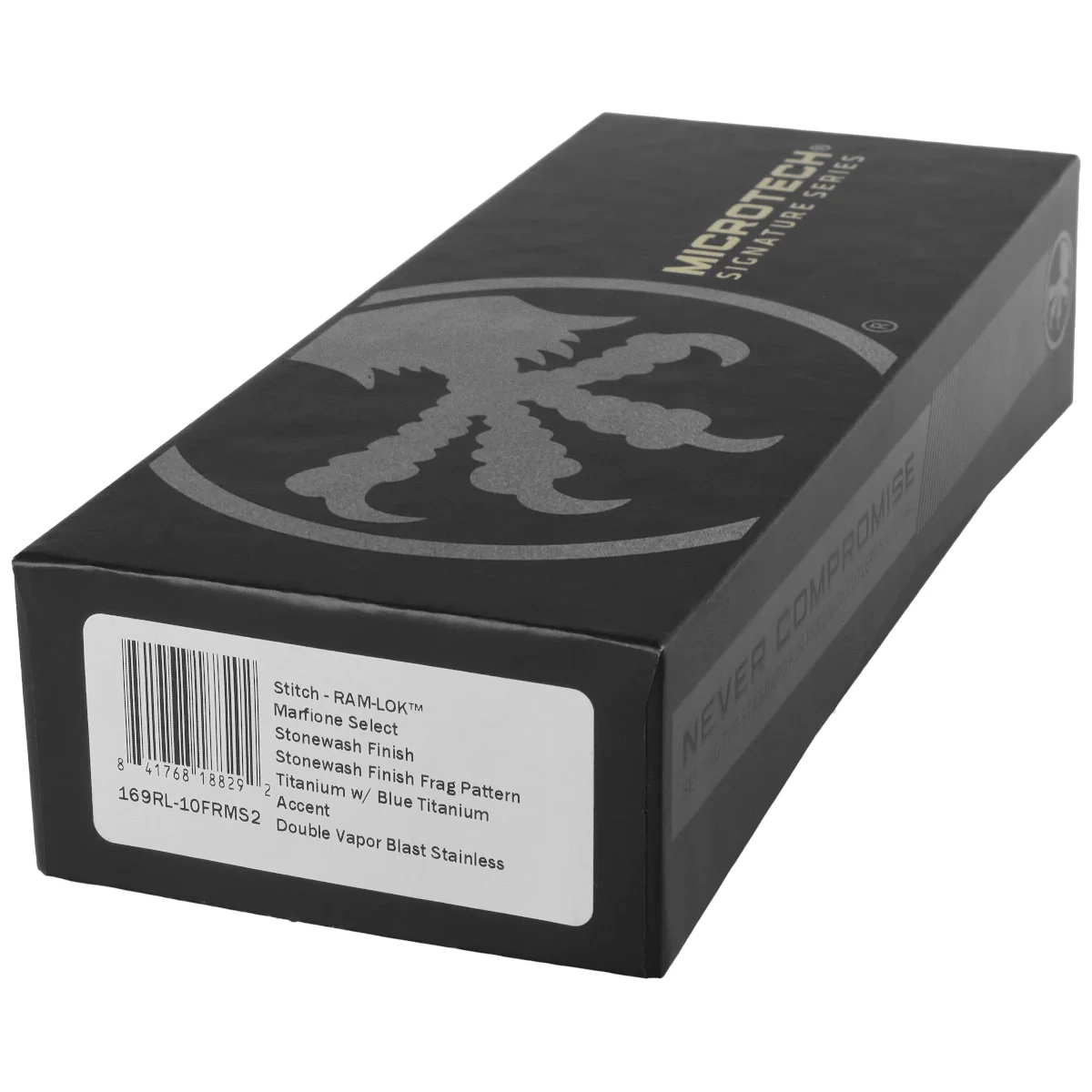 Stitch Ram-Lok S/E Marfione Select Signature, Stonewashed Frag Titanium, Double Vapor Blast HW, Stonewashed manual version of the bold design of the versatile tactical knife, created in collaboration between Sebastijan Berenji and Microtech. Wide Blade finished in Stonewashed. Handles made of titanium in Stonewashed Frag Pattern, with titanium blue backspacer. A model from the elite Marfione Select series, the Signature is a tactical knife made with the utmost precision, attention to the smallest details and the finest materials.