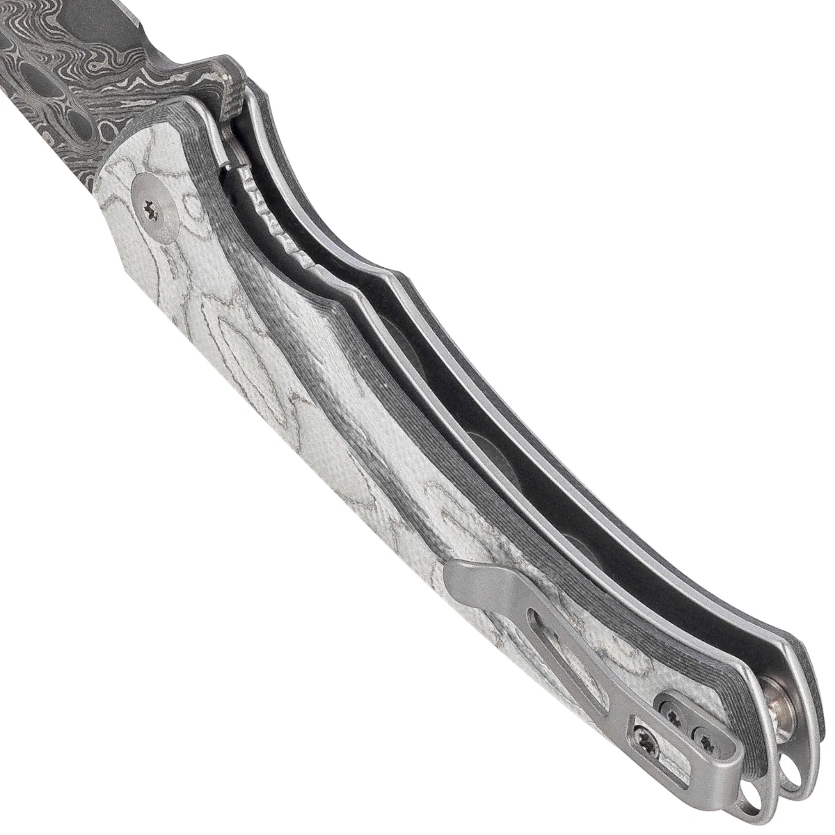 Blade - drop point type was made of durable stainless damast, offering good sharpness retention, resistance to rust and ease of sharpening. The hollow grind ensures precise blade guidance, and the acid etched finish highlights the steel's pattern line. Opening is done with a flipper, which, combined with ceramic bearings, guarantees velvety-smooth blade movement - no resistance, no noise, with immediate readiness for action.