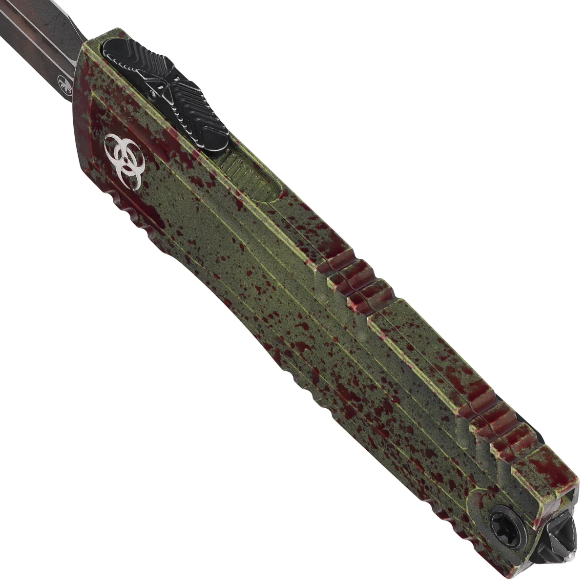 Luminary ZBP D/E Signature Outbreak Aluminum, Outbreak is a full-size OTF(Out The Front) automatic knife from Microtech's prestigious Signature Series line without any blade play when unfolded! The blade play free automatic is distinguished by a number of improvements such as; Crud Kutter™, Dual-Fuel Drive Train™, Zero Blade Play™. The model is distinguished by a unique“Outbreak” finish in green with red splashes (“blood splatter”) and a deeply engravedbiohazard symbol(Biohazard), being the hallmark of this limited edition. Operating in D/A (Double Action) mode, it allows the blade to be instantly extended and retracted with a flick of the thumb, guaranteeing unparalleled speed and reliability in situations requiring immediate response. The proprietary design by Tony Marfione, founder and owner of Microtech Knives, combines modern design with the highest quality workmanship to create a unique model valued by collectors and professional users alike.