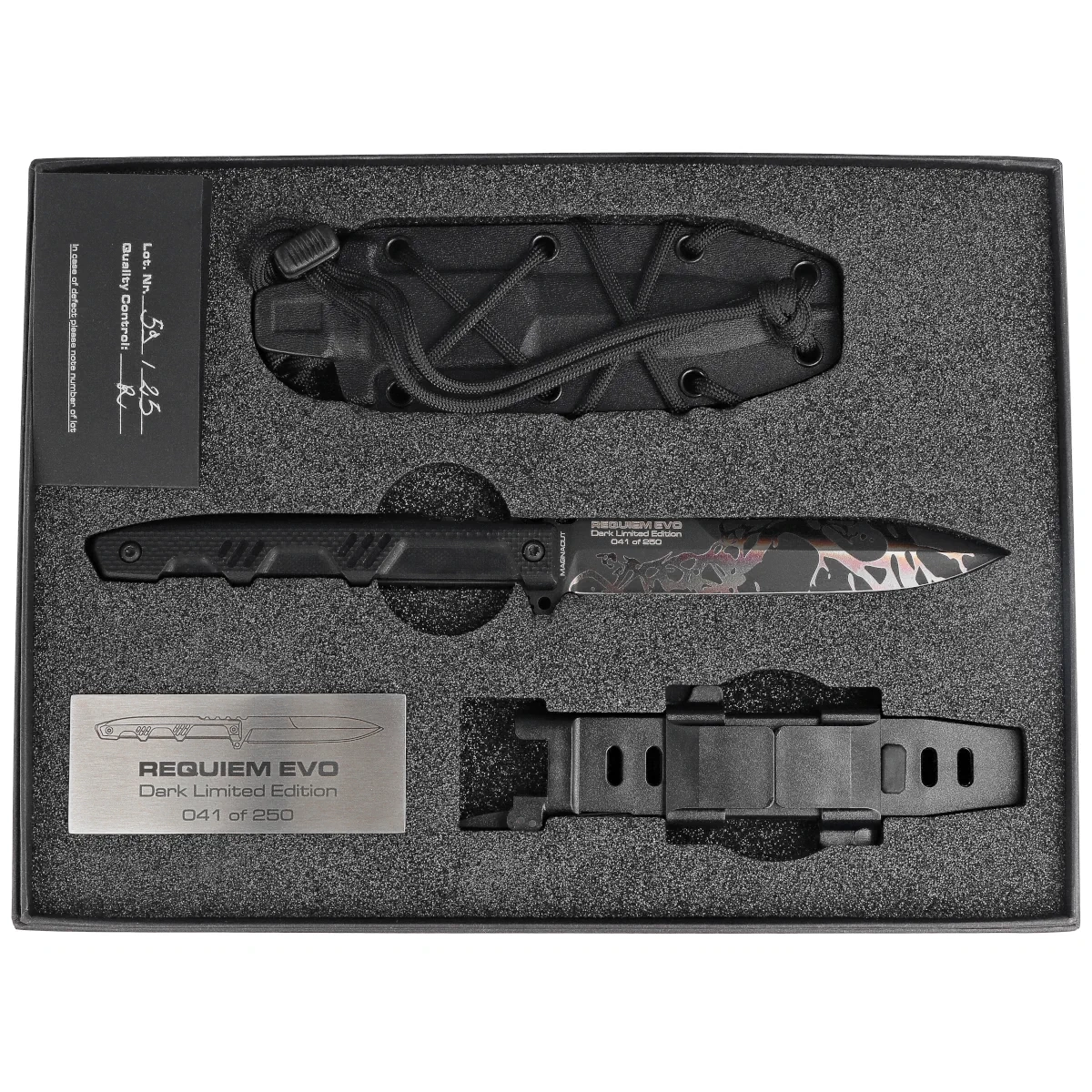 - Requiem Evo Dark LE No 041/250 Black G10, Burnishing a limited to 250 copies tactical knife with a blade made of CPM MagnaCut steel. Full tang construction, black G10 Handle and two Sheaths, a Tactic one made of ASPIS and an EDC one made of Kydex.
