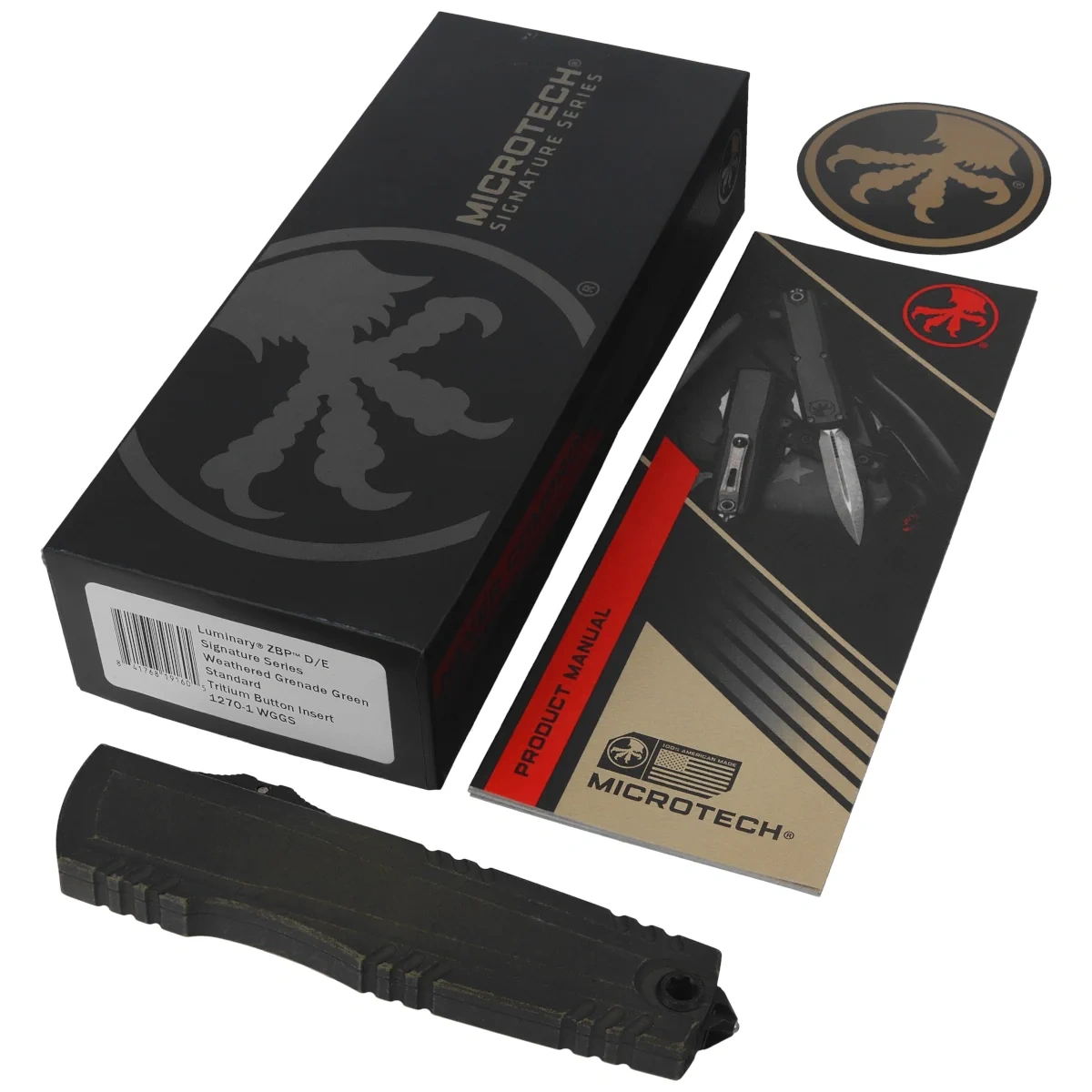 Luminary ZBP D/E Signature Weathered Grenade Green Aluminum, Weathered Grenade Green is a full-size OTF (Out The Front) automatic knife from the prestigious Signature Series. The design is characterized by the absolute absence of any blade play when unfolded - full rigidity and reliability of the mechanism. The blade machine “blade play free” is distinguished by a number of improvements such as; Crud Kutter™, Dual-Fuel Drive Train™, Zero Blade Play™. Operating in D/A (Double Action) mode, it allows the blade to be instantly extended and retracted with a flick of the thumb, guaranteeing unparalleled speed and reliability in situations requiring immediate response. The proprietary design by Tony Marfione, founder and owner of Microtech Knives, combines modern design with the highest quality workmanship to create a unique model valued by collectors and professional users alike.