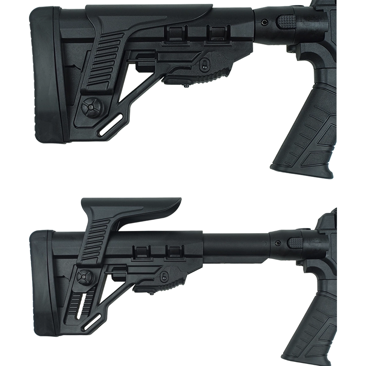 Stocktactical-style with a rubberized pistol grip and a fully adjustable AR-15-type buttstock. The telescopic stock features a vertically adjustable cheek rest and a rubberized butt pad. The side-folding design makes transport and storage more convenient. The rifle’s body is constructed from durable polymer.