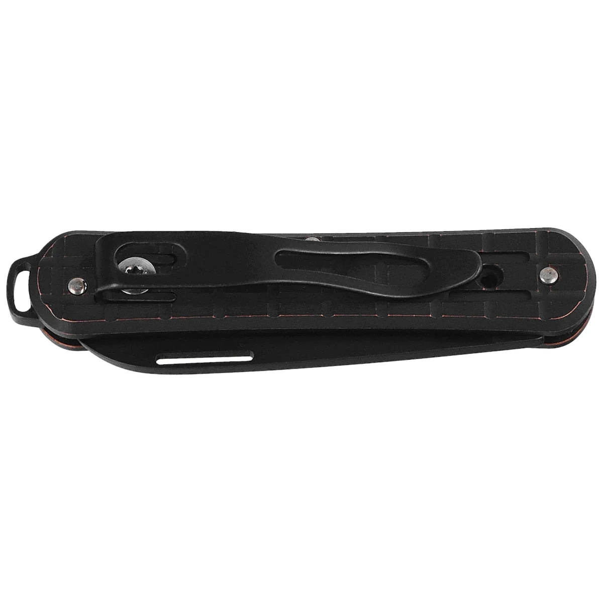 Handle - grips made of temperature and mechanical damage resistant copper. Covered with black PVD coating and rubbed on the edges, it gives a great visual effect. The distinctive texture of the Handle imitating the surface of a fragmentation grenade(Frag Pattern) in addition to visual value makes the knife does not slip in the hand during use. The simple shape fits perfectly in any hand. The two-position clip allows the knife to be carried in tip-up or tip-down position. In the back, a wide “eye” for threading a belay or decorative cord.
