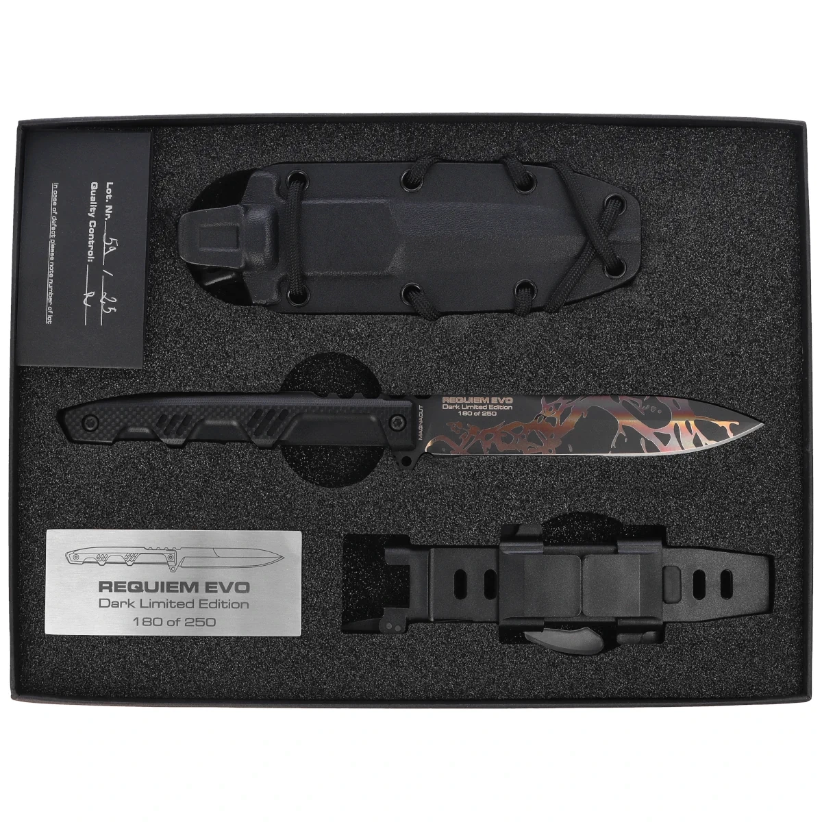 - Requiem Evo Dark LE No 180/250 Black G10, Burnishing a limited to 250 copies tactical knife with a blade made of CPM MagnaCut steel. Full tang construction, black G10 Handle and two Sheaths, a Tactic one made of ASPIS and an EDC one made of Kydex.