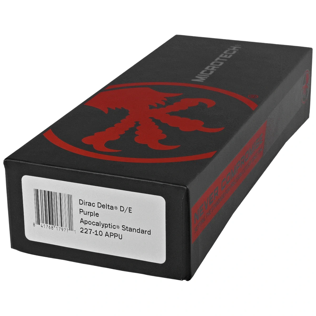 Dirac Delta D/E Purple Aluminum, Apocalyptic is an enlarged OTF automatic knife from the Dirac series. Operating in D/A mode , it features a hellishly fast blade extension mechanism. Slider button on the side of the handle. 100% made and assembled in the USA. Designed by Anthony Marfione, knifemaker and owner of Microtech Knives.