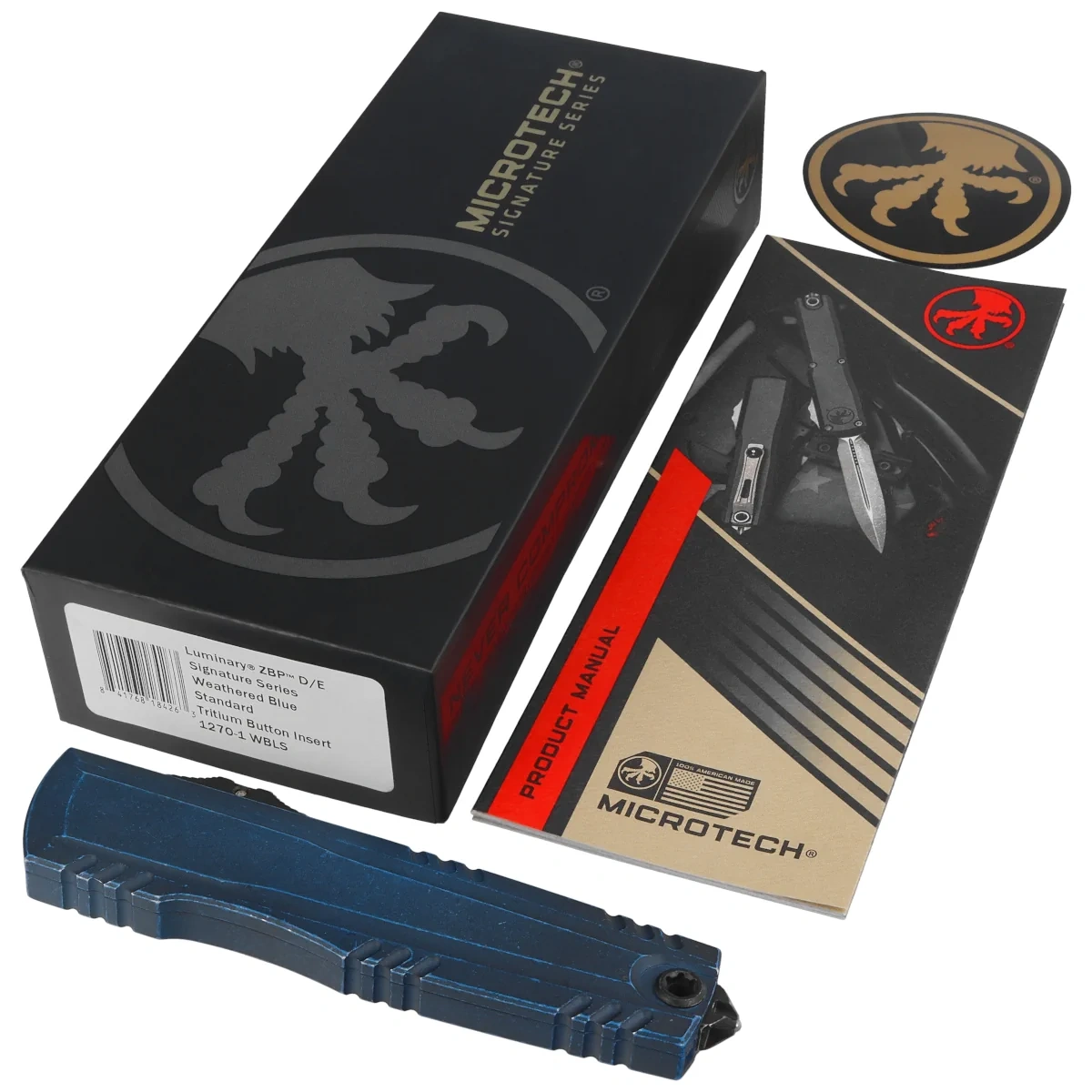 - Luminary ZBP D/E Signature Weathered Blue Aluminum, Weathered Blue - an OTF knife equipped with advanced ZBP, Crud Kutter, Dual-Fuel Drive Train, and Zero Blade Play systems, ensuring reliable mechanism operation and zero blade play when deployed.