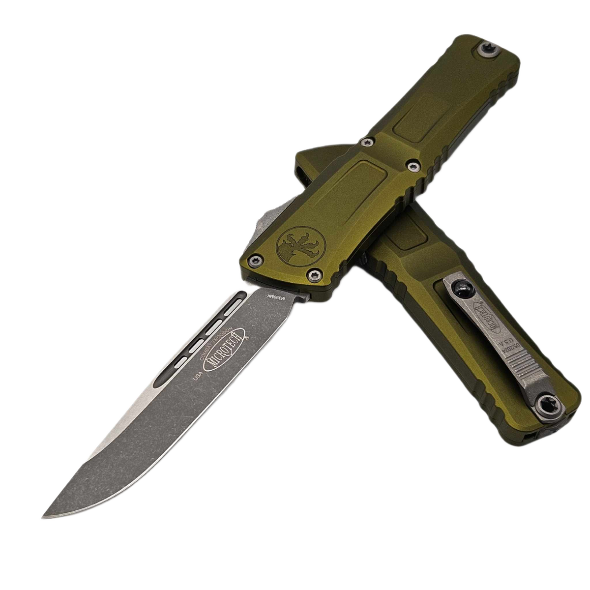 Combat Troodon Gen III S/E OD Green Aluminum, Apocalyptic this largest of the automatic knives is the pinnacle of precision engineering and tactical prowess in the field of OTF (Out The Front) knives. Built for a wide range of utility applications, it boasts a 25% larger size compared to the flagship Troodon. Precisely crafted, it features a sophisticated and hellishly fast mechanism that extends the razor-sharp blade. 100% made and assembled in the USA. Designed by Anthony Marfione, knifemaker and owner of Microtech Knives.