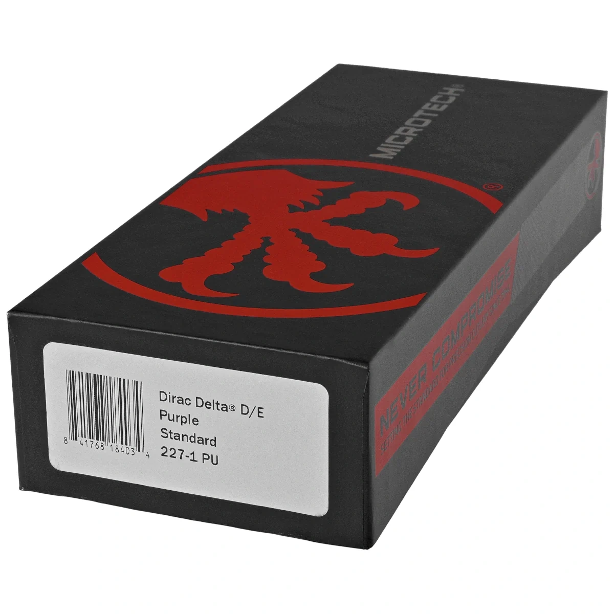Dirac Delta D/E Purple Aluminum, Black is an enlarged OTF automatic knife from the Dirac series. Operating in D/A mode , it features a hellishly fast blade extension mechanism. Slider button on the side of the handle. 100% made and assembled in the USA. Designed by Anthony Marfione, knifemaker and owner of Microtech Knives.