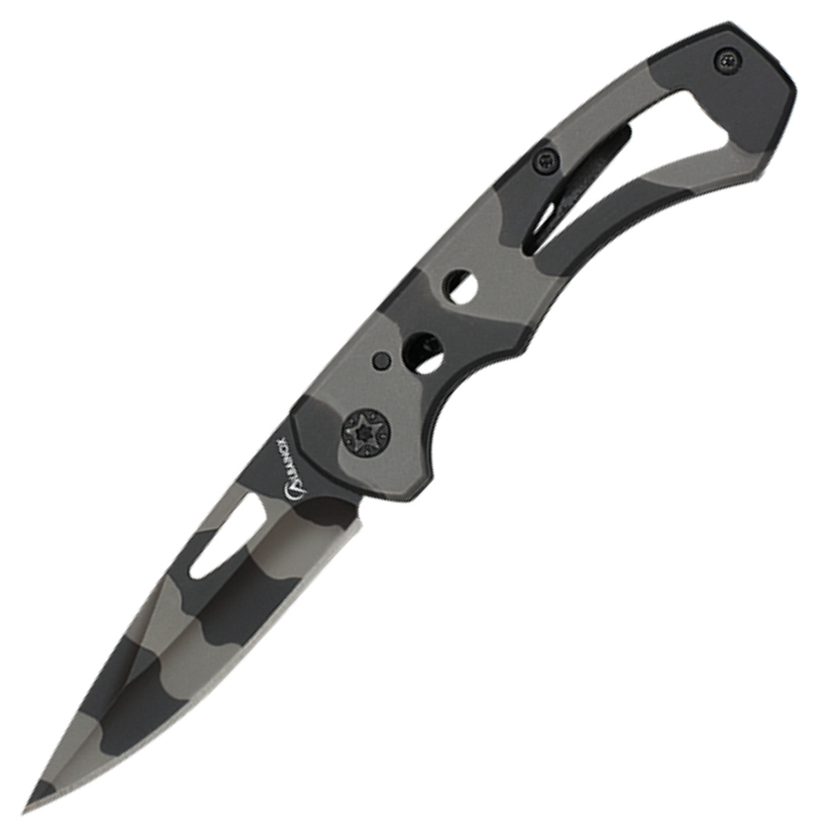 • Urban Camo Stainless Steel, Urban Camo is an EDC folder with a modern silhouette, featuring a Blade of 3Cr13MoV steel and a Handle of steel covered with an urban camo pattern. The design combines technical looks with durability and functionality for EDC.