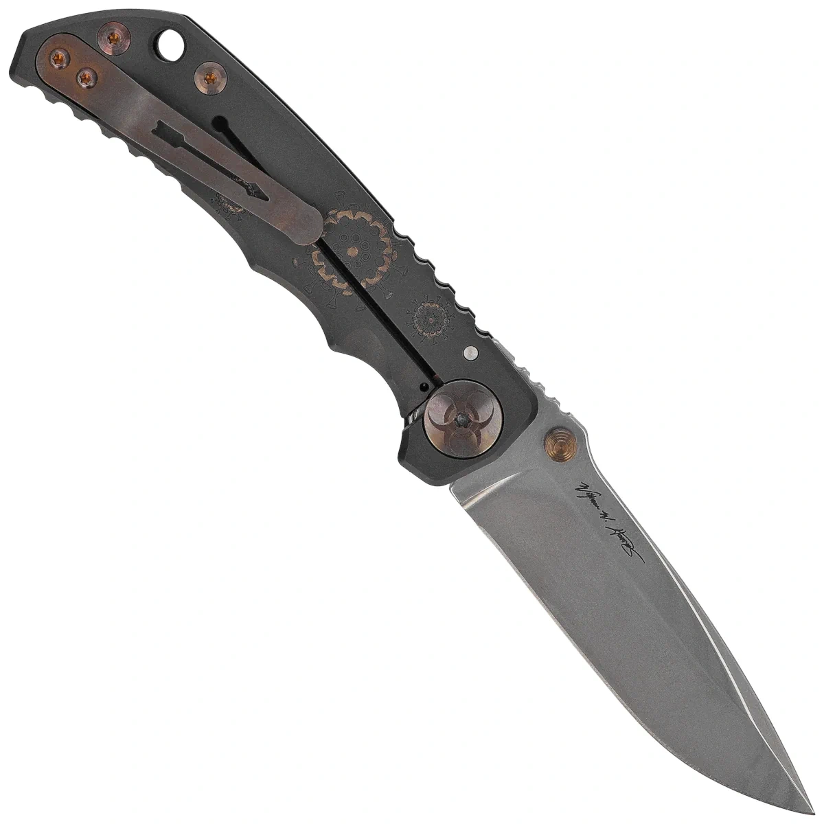 Handle - made of solid titanium 6AL4V has beveled edges of the covers, eliminating sharp points. The surface is decorated with an artistic engraving of “Plague Doctor”. The so-called open-backed design without the typical backspacer, attached to each other with titanium spacer sleeves for easy cleaning. The simple but solid construction guarantees many years of use. There are notches (jimping) on the edges of the Handle, improving grip security. The axis of the pivot is decorated with a designer screw, and all fasteners (screws, clip) are anodized bronze. A double-sided (right/left) titanium clip, decorated with an arrow motif, allows the knife to be carried in tip-up position. Above the clip is a hole designed for threading a safety cord.