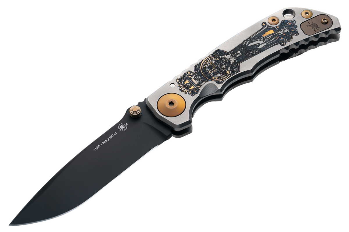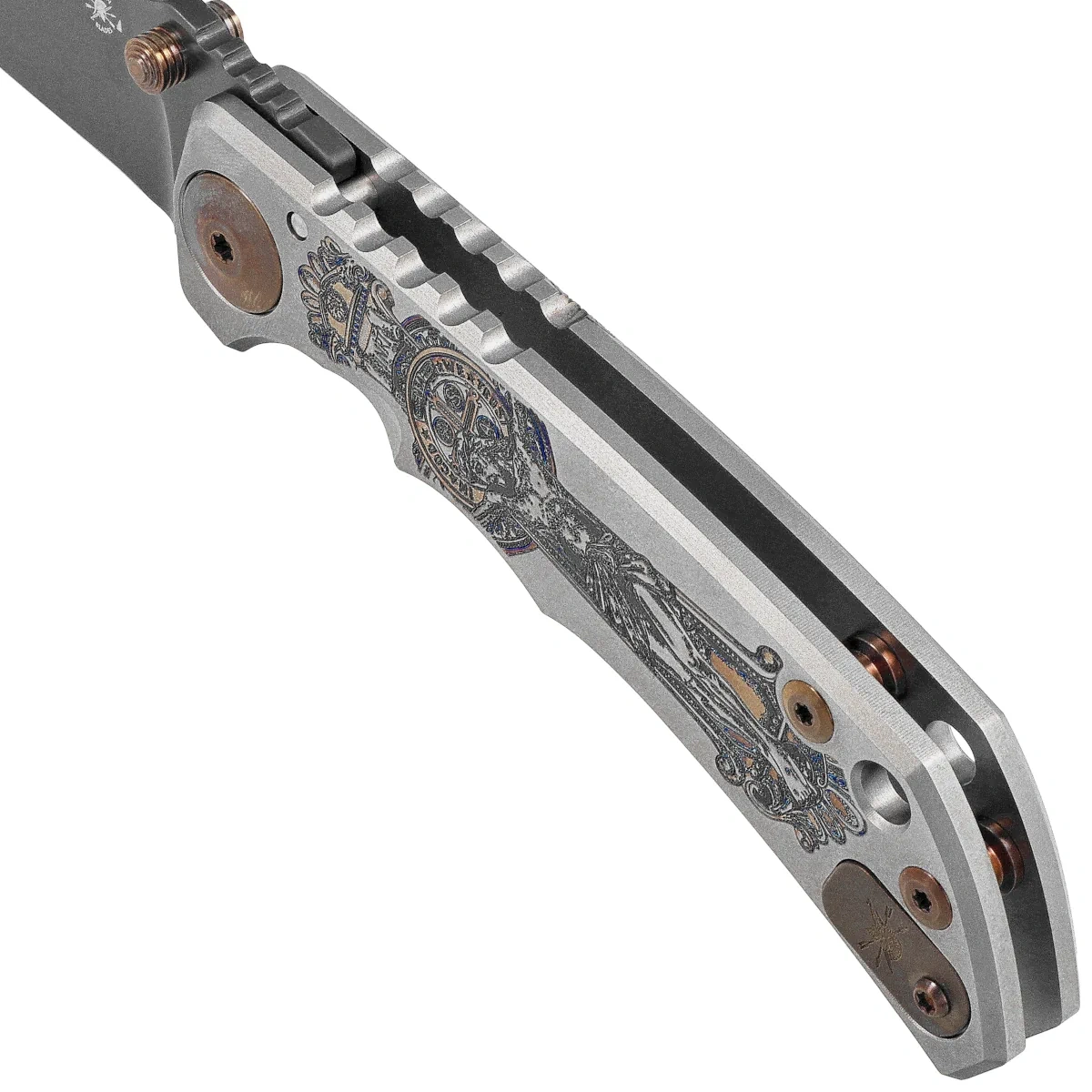 The solid titanium handle is decorated with artistic engraving of “Crusaform”. Thanks to the properly contoured handle, the knife sits securely in the hand, ensuring precision when performing a variety of activities. A robust frame lock mechanism guarantees safe use even in extreme conditions. Each piece is handmade in the USA, making it a valuable and sought-after item among both collectors and discerning users.