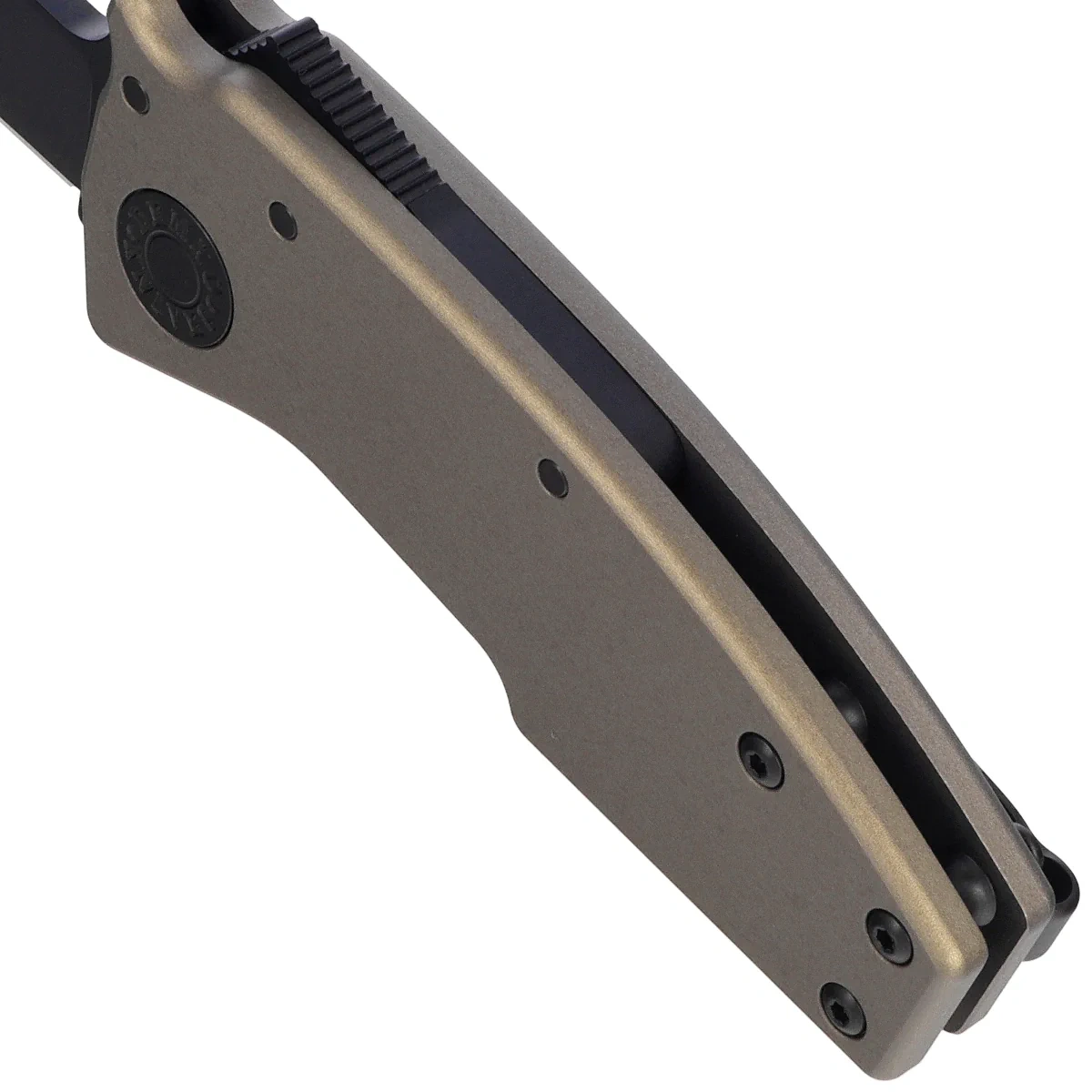 Shark-Lock™ located on the back of the knife, the mechanism is operated by a ramp-like “flipper”. Opening the blade causes the spring-driven locking arm to move up and then into a notch in the shank, placing it under the locking pin. Uniquely, the locking mechanism moves forward and backward while simultaneously moving up and down. This allows for an increase in the size of the blade contact area, providing better mechanical strength in a specific area. And since the drive spring that moves the locking element upward to the locked position is located in the locking arm itself, it will not be exposed to dirt and debris.