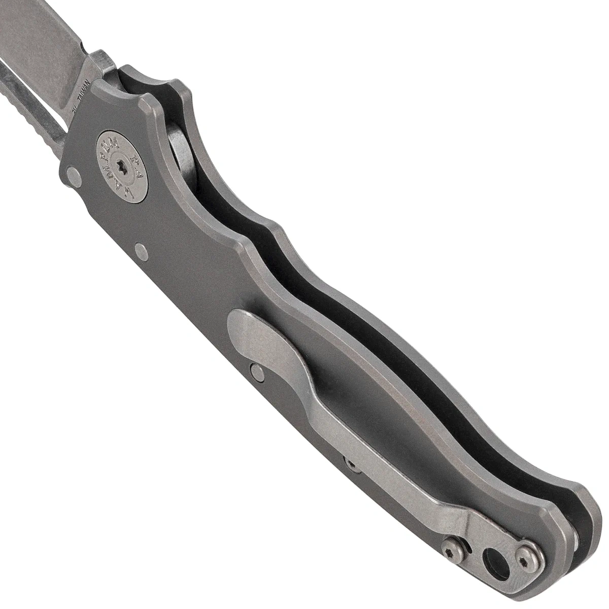 Handle - grips made of titanium, distinguished by lightness, rigidity and resistance to external conditions. Profiled undercuts promote a secure grip, even with gloves. Steel spacers increase the rigidity of the entire structure, and the deep-carry clip allows convenient and discreet carrying in the pocket. In addition, a left-side clip is included, for left-handed users. Torx-style mounting components simplify removal and servicing of the knife. The Shark-Lock™, located at the top of the Handle, works instantly, providing full control and safety, regardless of your preferred grip or dominant hand.
