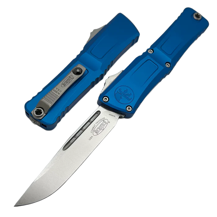 Combat Troodon Gen III S/E Blue Aluminum, Stonewashed this largest of the automatic knives is the pinnacle of precision engineering and tactical prowess in the field of OTF (Out The Front) knives. Built for a wide range of utility applications, it boasts a 25% larger size compared to the flagship Troodon. Precisely crafted, it features a sophisticated and hellishly fast mechanism that extends the razor-sharp blade. 100% made and assembled in the USA. Designed by Anthony Marfione, knifemaker and owner of Microtech Knives.