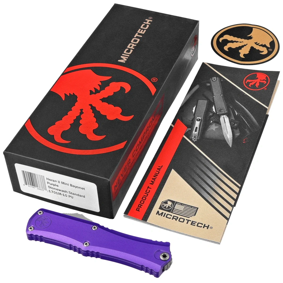 Microtech Hera II Mini Bayonet OTF Knife Purple Aluminum, Stonewashed M390MK by Tony Marfione (1701M-10PU)