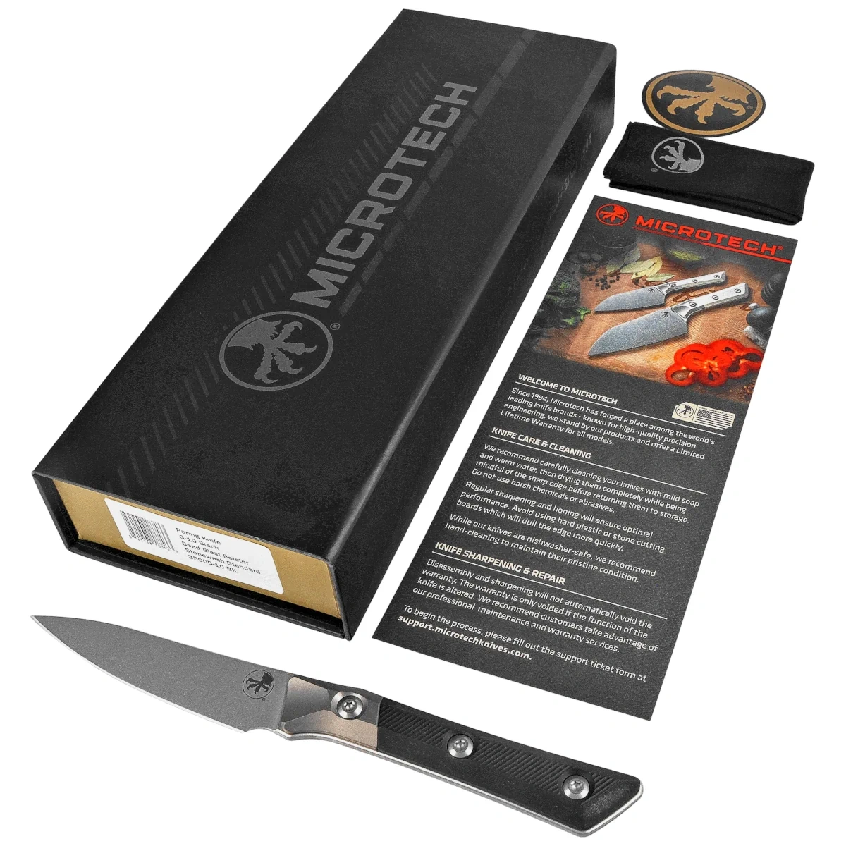 Pairing Titanium Bolster/Black G10, Stonewashed is a modern interpretation of the traditional kitchen knife by one of America's most respected knife brands. Created in the spirit of technical perfection and utilitarian minimalism, it is the perfect tool for professional chefs and enthusiasts of precision cutting. The traditional silhouette is enhanced here with high-end materials and ergonomics refined to perfection. Blade made of advanced M390MK steel offers excellent sharpness retention, full corrosion resistance and microstructure stability, even under heavy use. Its stonewashed finish gives the surface a matte texture that effectively masks traces of use and adds a professional, working character to the blade . The pairing profile makes the knife successfully perform the tasks of peeling, cleaning or shaping, while maintaining smooth operation and precise blade guidance. The handle is made of titanium and durable G10 composite, a material resistant to moisture, temperature and mechanical factors. Subtle milling improves the grip, and the minimalist geometry of the handle provides stable support for the hand - regardless of the intensity of work. Mounting elements in the form of torx screws increase the rigidity of the design and allow easy disassembly for maintenance. Thanks to the perfectly balanced combination of ergonomics, durability and modern design, the Pairing model from Microtech is perfect both in the professional kitchen and in the hands of the home user who does not consider compromising on quality. The included protective blade sheath allows for safe storage and transportation. This is a knife that not only meets expectations - he redefines them.