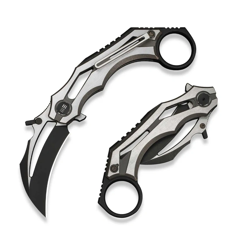 316,75 €Cryonix Bronze/Satin Titanium, Black Stonewashed/Satin is the result of WE Knife brand's modern approach to karambit knife design, where CNC machining technology meets the functionality of everyday use. The knife's distinctive silhouette, pronounced chamfers and geometric milling indicate a thoughtful engineering form - tailored to both the hand and the real needs of EDC. Cryonix presents an uncompromising approach to ergonomics, aesthetics and durability, becoming a tool for those who value quality at the level of flagship designs. Blade is made of Böhler M390 powder steel , whose properties - high sharpness retention, corrosion resistance and structural stability - make it an ideal material for intensive use. The surface finished in the black stonewashed style with satin-finished bevels exposes the technical geometry of the blade, while limiting the visibility of scratches. The profile used promotes precision, and the smooth opening mechanics ensure intuitive operation regardless of the context. The Handle, based on milled titanium, presents a clearly defined, multi-faceted form that promotes control and grip stability. The components have been perfectly fitted together, and the design has been adapted for long-term carry - with a discreetly integrated clip and a balanced body. Cryonix is for users who expect premium aesthetics, reliable performance and high performance culture in a modern folding knife.