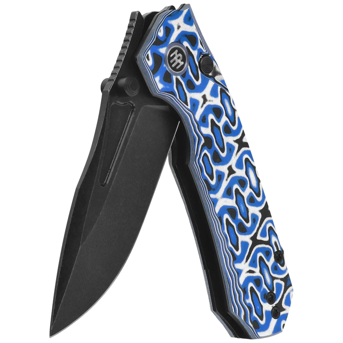 - RT-Rhino Blue/White G10, Black Stonewashed handy compact EDC folding knife. Blade drop point made of D2 tool steel, fast Front Flipper blade for opening and G10 handle. Excellent value for money! Bestseller!