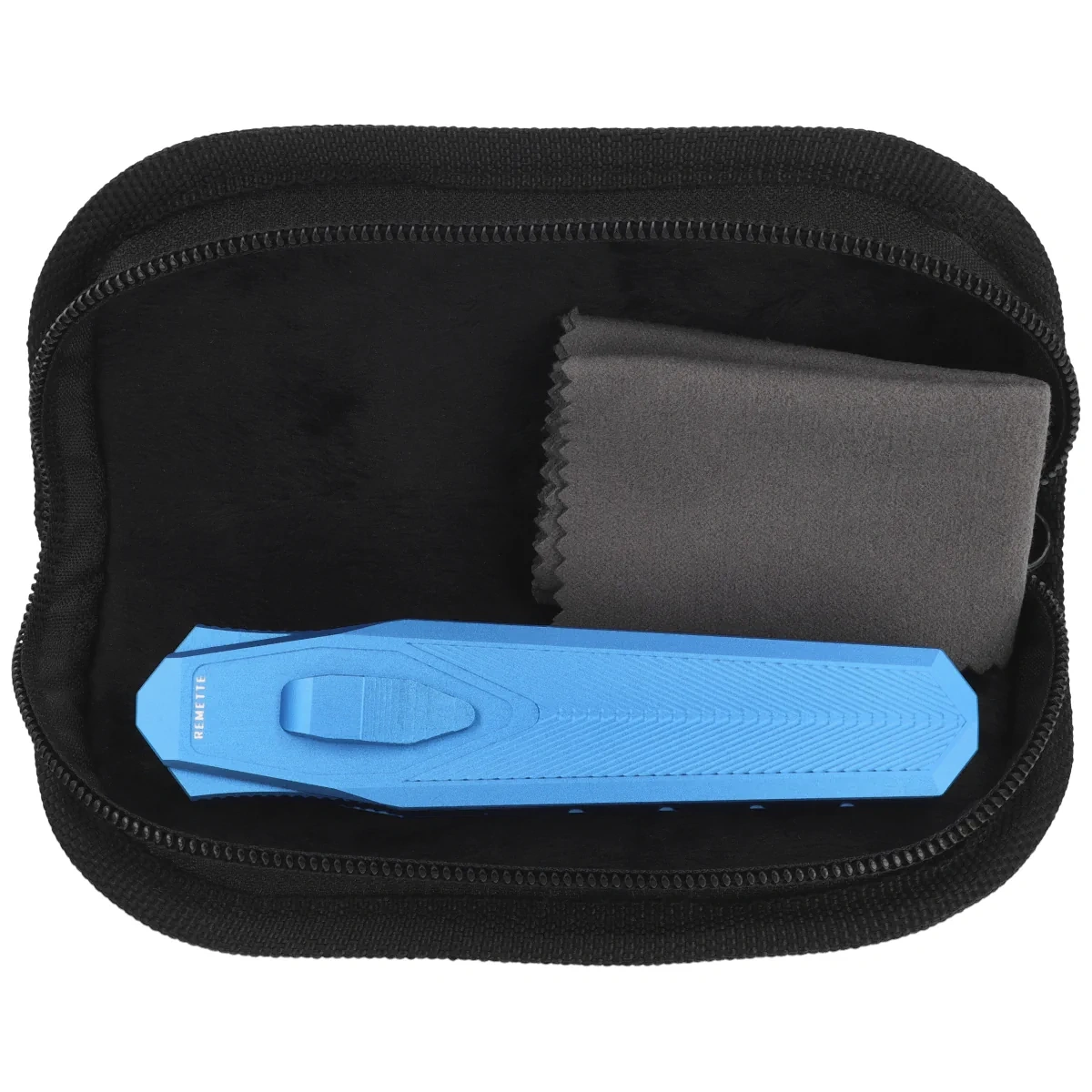 Swordfish T Blue Aluminum / Fat Carbon, Stonewashed opening intuitive, folding knife from the Remette Knives manufactory, a display of engineering in design. Gravity, Blade extends from the front due to the force of gravity. Modeled on the design of the Luftwaffe gravity air knife, commonly known as the knife of German paratroopers. Intuitive blade ejection / retraction with one hand (under the influence of gravity) and excellent materials such as 14C28N blade steel and aluminum handle, perfectly combined with the unmatched quality of the Remette brand!