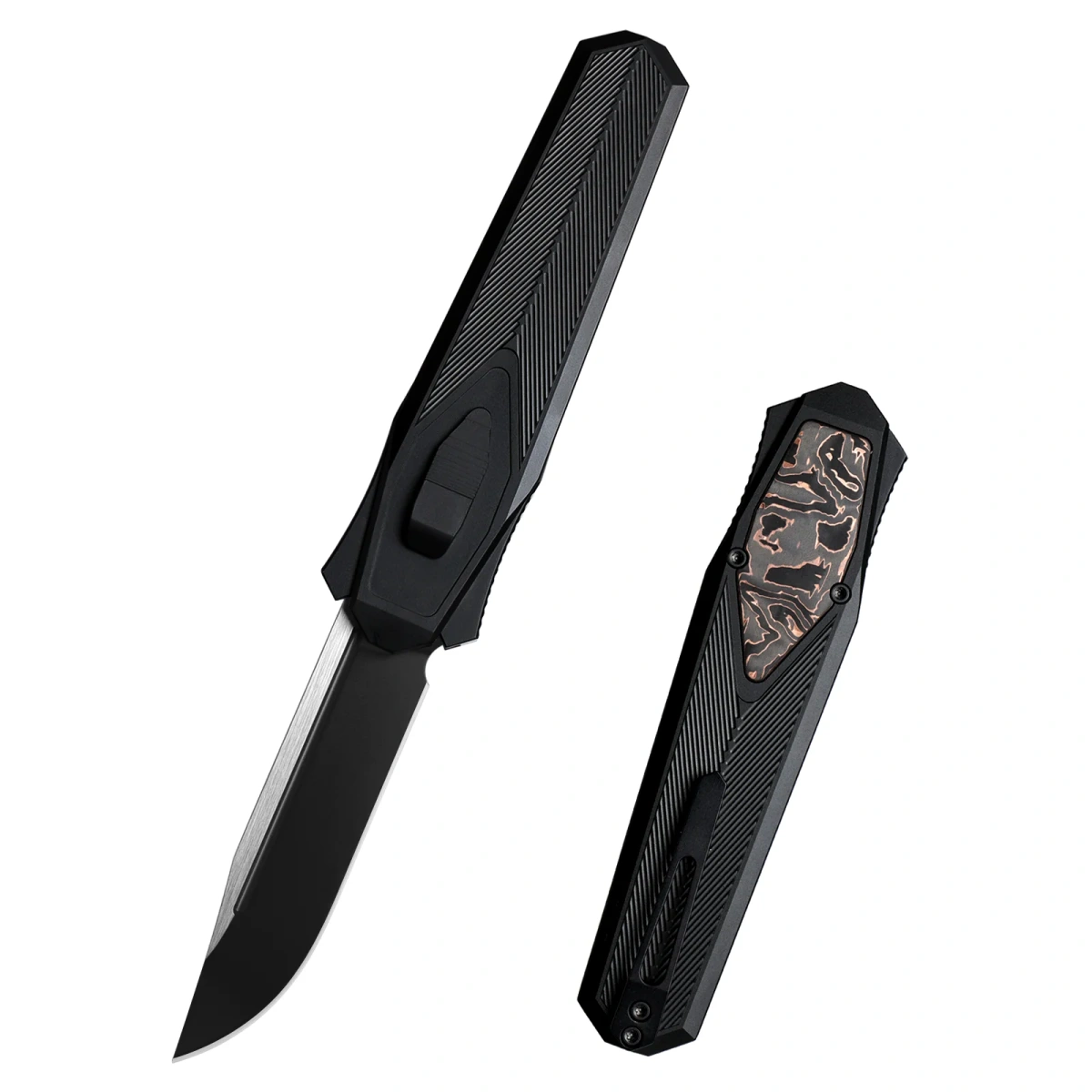 Swordfish CP Black Aluminum / Copper Carbon Fiber, Titanium Black intuitive opening, folding knife from the Remette Knives manufactory, a display of engineering in design. Gravity OTF (Out The Front), Blade extends from the front due to the force of gravity. Modeled on the design of the Luftwaffe gravity air knife, commonly known as the knife of German paratroopers. Intuitive blade ejection / retraction with one hand (under the influence of gravity) and excellent materials such as CPM S35VN blade steel and aluminum handle, perfectly combined with the unmatched quality of the Remette brand!