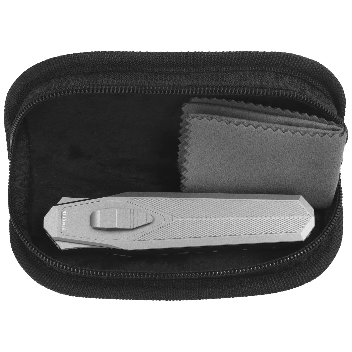 Swordfish CP Gray Aluminum / Carbon Fiber, Ceramic Sandblasted open intuitive, folding knife from the Remette Knives manufactory, a display of engineering in design. Gravity OTF (Out The Front), Blade extends from the front due to the force of gravity. Modeled on the design of the Luftwaffe gravity air knife, commonly known as the knife of German paratroopers. Intuitive blade ejection / retraction with one hand (under the influence of gravity) and excellent materials such as CPM S35VN blade steel and aluminum handle, perfectly combined with the unmatched quality of the Remette brand!