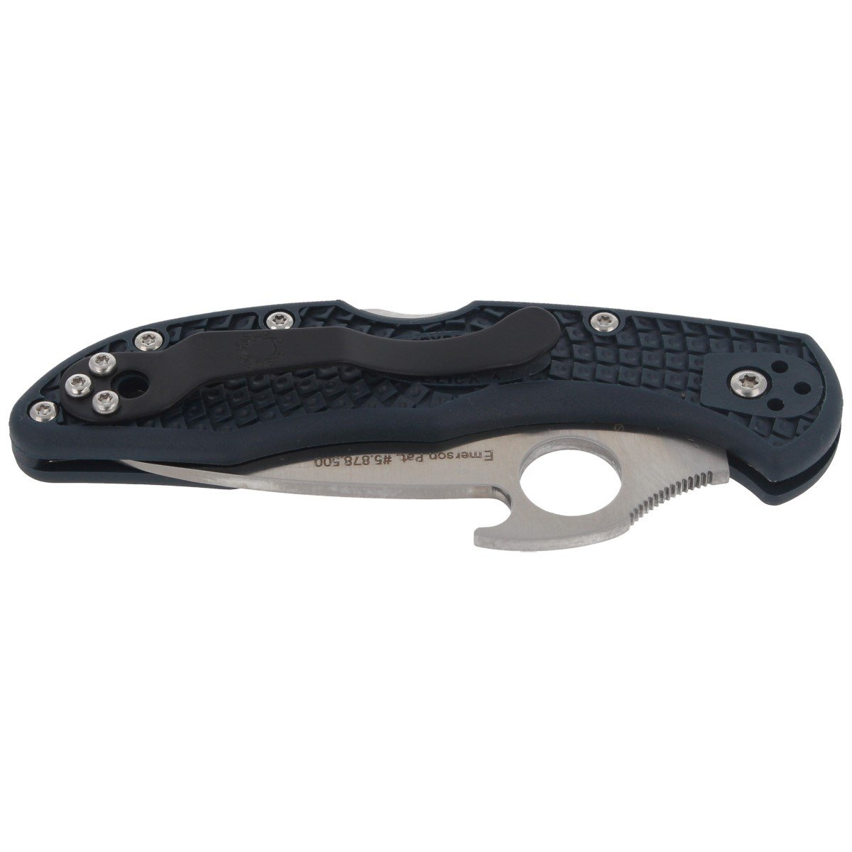 - Delica 4 FRN Grey Emerson Opener, z umieszczonym na grzbiecie głowni hakiem Ernesta Emersona umożliwia otwarcie klingi podczas wyjmowania noża z kieszeni spodni poprzez zaczepienie haka o krawędź kieszeni. Blokada Back-Lock. Stal VG-10. Klips 4-way clip..