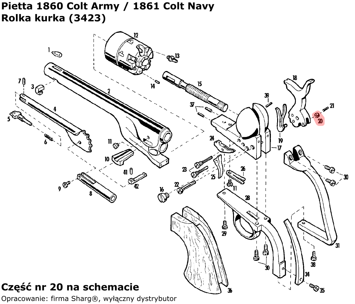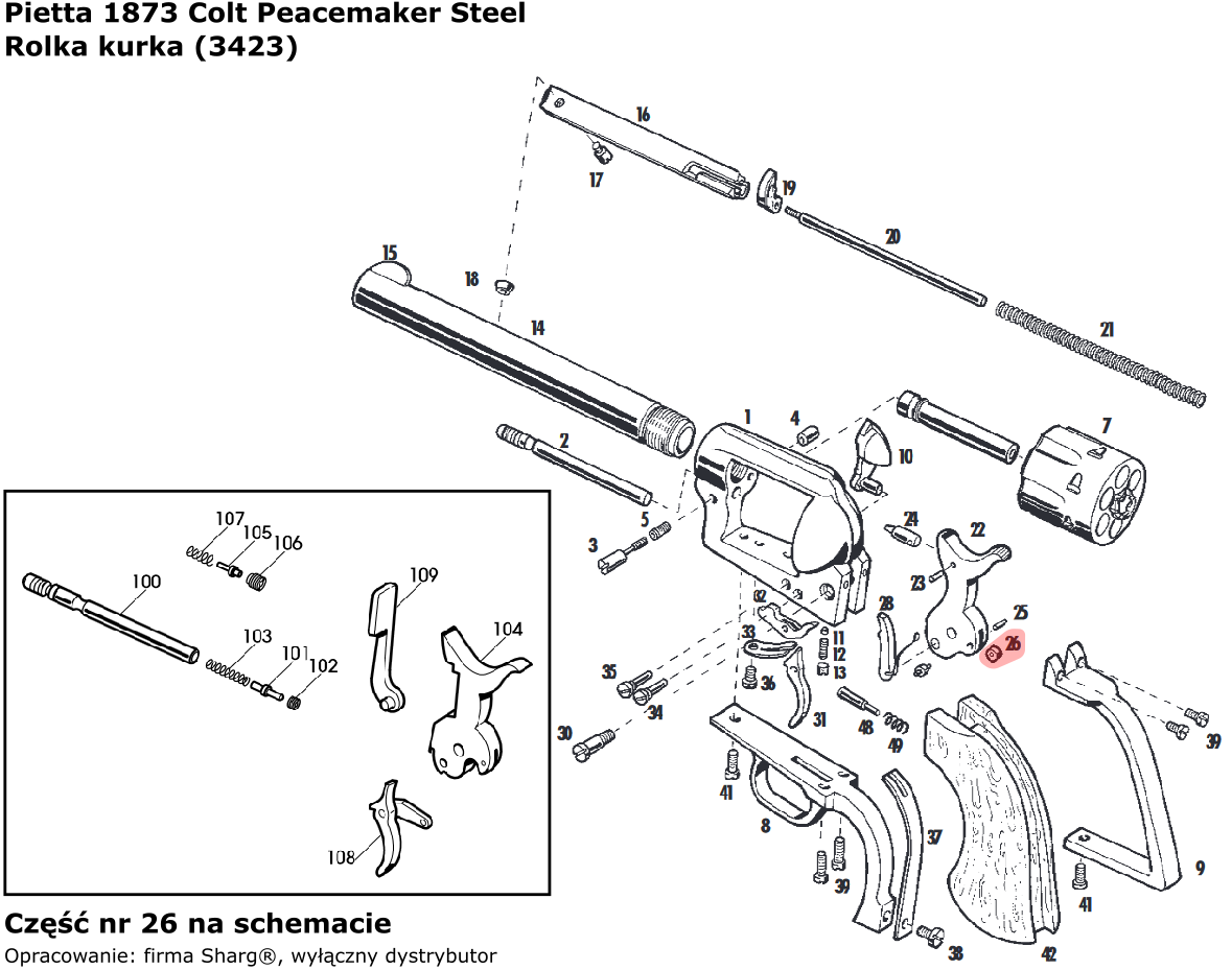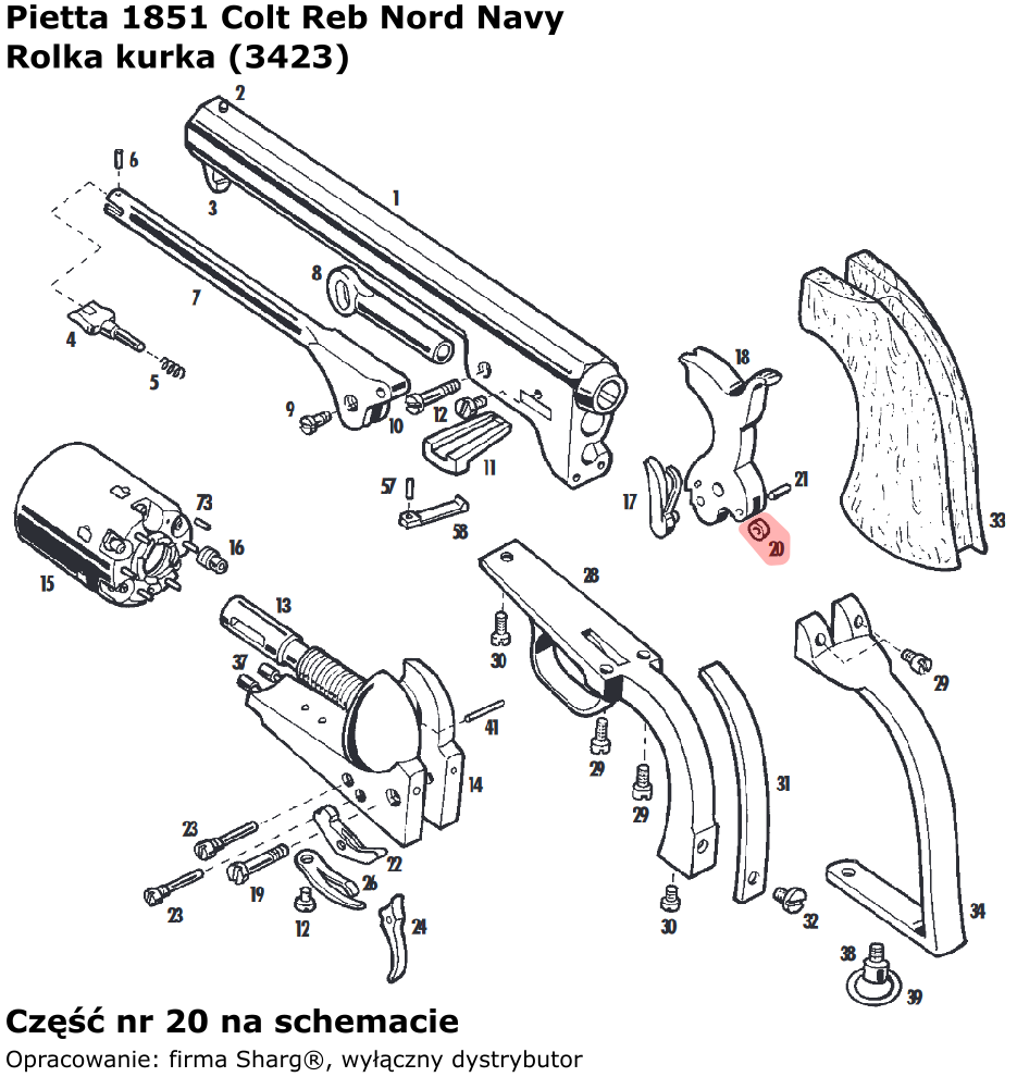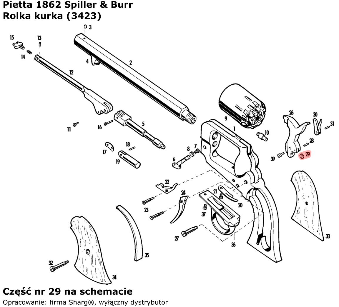 3423 (serwis) rolka kurka do rewolweru czarnoprochowego 1858 Remington New Model Army (.44 cal) / Navy (.36 cal) firmy Pietta. Pasuje również do modeli: 1862 Spiller & Burr, 1873 Single Action Steel, 1851 Colt Reb Nord Navy, 1860 Army oraz 1861 Navy