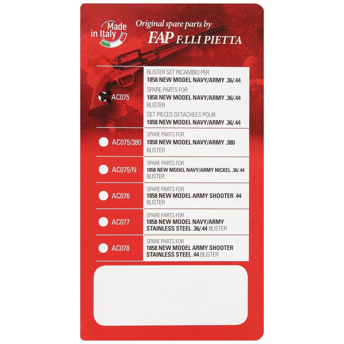- AC075 (serwis), zestaw niezbędnych części eksploatacyjnych do kapiszonowych rewolwerów czarnoprochowych 1858 Remington New Model Navy/Army .36/.44 cal firmy Pietta Arms.