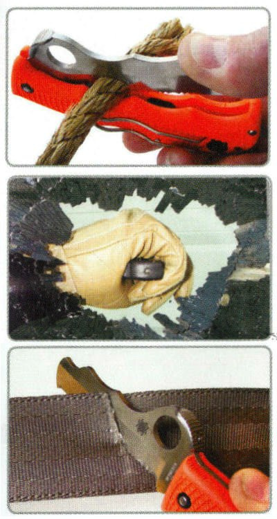Rękojeść - w jaskrawym kolorze pomarańczowym. Wykonana z tworzywa FRN (Fiberglass Reinforced Nylon), nylonu wzmocnionego włóknem szklanym, posiada dwukierunkową antypoślizgową teksturę okładzin (Bi-Directional Texturing) zapewniającą doskonały uchwyt w rękawicy jak również tłustymi, brudnymi lub wilgotnymi dłońmi. Nóż wyposażono w przykręcany drutowy klips (lewo/prawostronny) pozwalający przenosić nóż w pozycji tip-up (czubkiem ku górze). Na końcu rękojeści ukryto zbijak do szyb z węglików spiekanych, który po mocnym ściśnięciu rękojeści wysuwa się gotowy do użycia. Za jego pomocą rozbijemy szybko każdą nawet wzmacnianą szybę samochodową. Z boku rękojeści wbudowano gwizdek sygnalizacyjny.