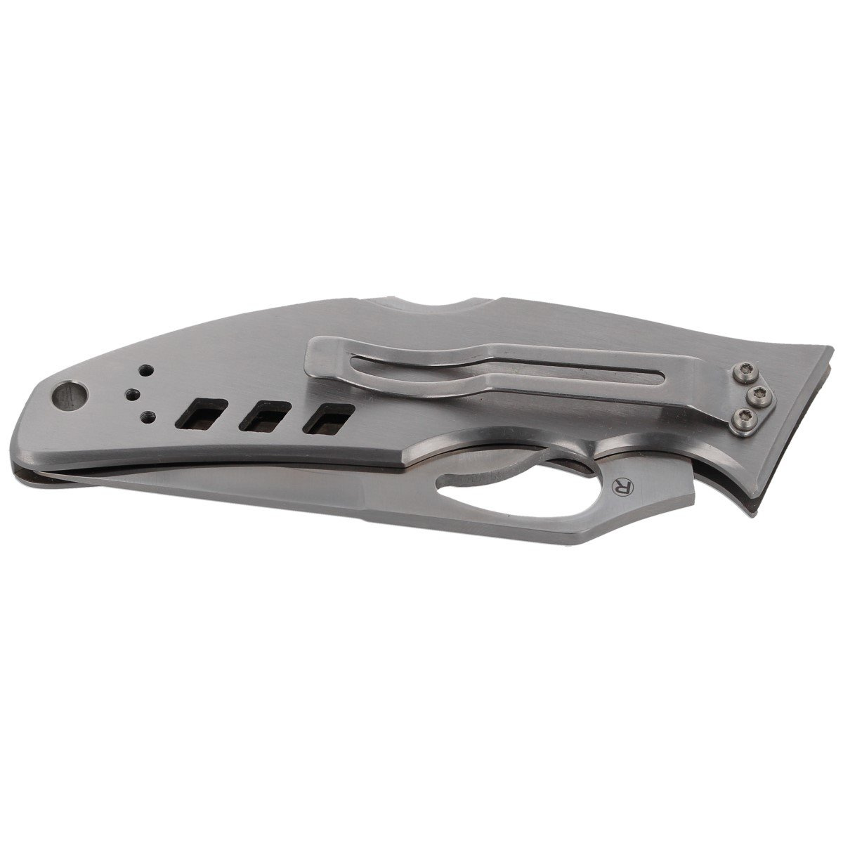 Rękojeść - klasyczne "oldschoolowe" satynowane okładziny ze stali nierdzewnej. Ergonomiczny kształt zapewnia wygodny, pewny uchwyt również w rękawicach. Otwory w okładkach pozwalają poprzez cyrkulację powietrza szybciej wysuszyć zamoczone, wilgotne ostrze. Scyzoryk wyposażono w prawostronny metalowy klips z możliwością mocowania w dwóch płaszczyznach (Right Tip-up / Tip-down). W tylnej części rękojeści lanyard hole, otwór umożliwiający mocowanie linki zabezpieczającej.