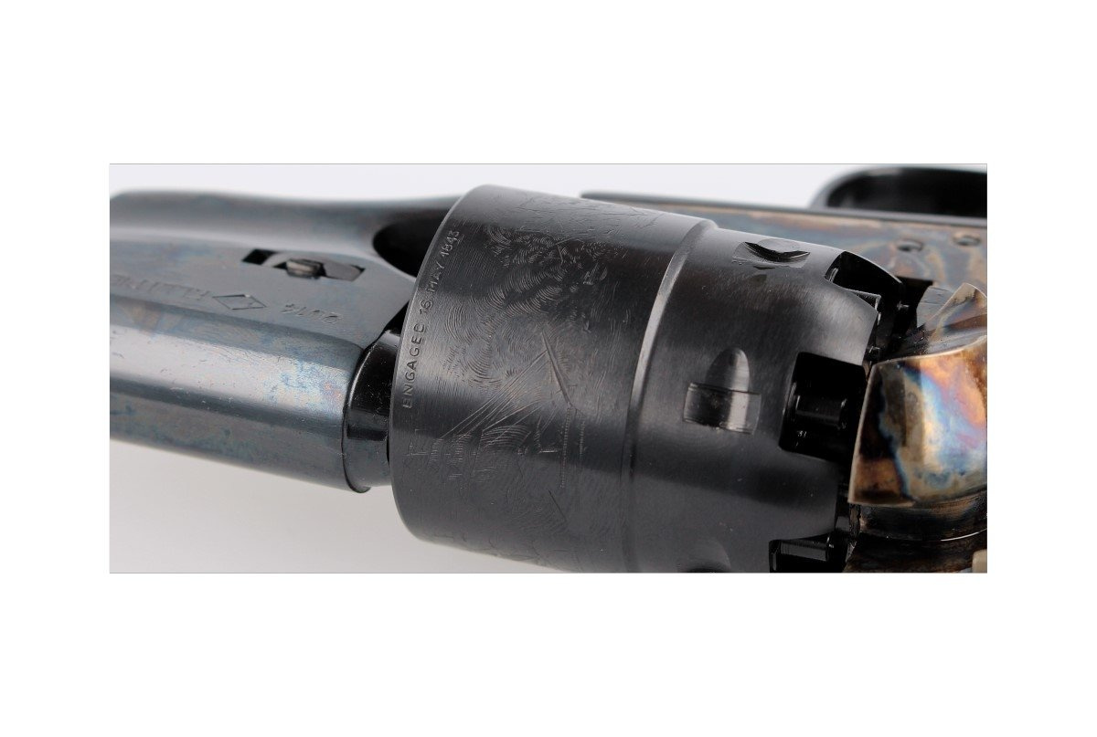 1862 Colt Pocket Police Snubnose .44 z ergonomicznym chwytem Thunderer. Wersja (LC) z okładzinami o ryflowanej strukturze (Checkered Grip). Najlepszy rewolwer do szybkiego dobycia oraz strzelania na małych dystansach: krótka lufa, poręczna rękojeść Thunderer. Na cylindrze bębna wygrawerowana scena zwycięstwa II Texas Navy w bitwie pod Campeche w roku 1843.
