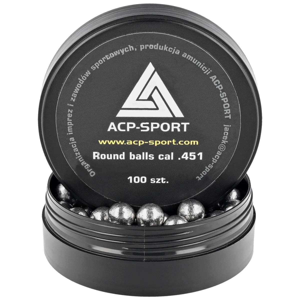 Nadkalibrowe polerowane kule ołowiane (136 gr) firmy ACP-Sport w kal. 451 (11.46 mm) do broni czarnoprochowej. Wykonane z czystego ołowiu produkowanego bez udziału ołowionośnych materiałów wtórnych. Dzięki poddaniu kul obtaczaniu nie posiadają one nadlewek, niedolewek, szwów i innych wad spotykanych w produktach o niższej jakości. Przeznaczone do strzelania z rewolwerów m.in. Remington Sheriff, Colt Sheriff, pistoletów oraz karabinów czarnoprochowych w kalibrach: .44, .45. Opakowanie zawiera 100 szt.
