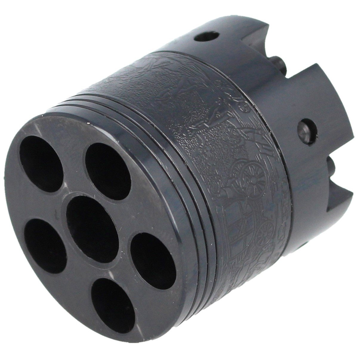 • A2092 pełny 5-cio komorowy bęben kapiszonowy firmy Pietta przeznaczony do rewolweru czarnoprochowego 1836 Colt Paterson Texas w kal. .36. Oksydowany na czarno z wygrawerowaną na cylindrze bębna sceną napadu na dyliżans. W zestawie komplet 5-ciu kominków.
