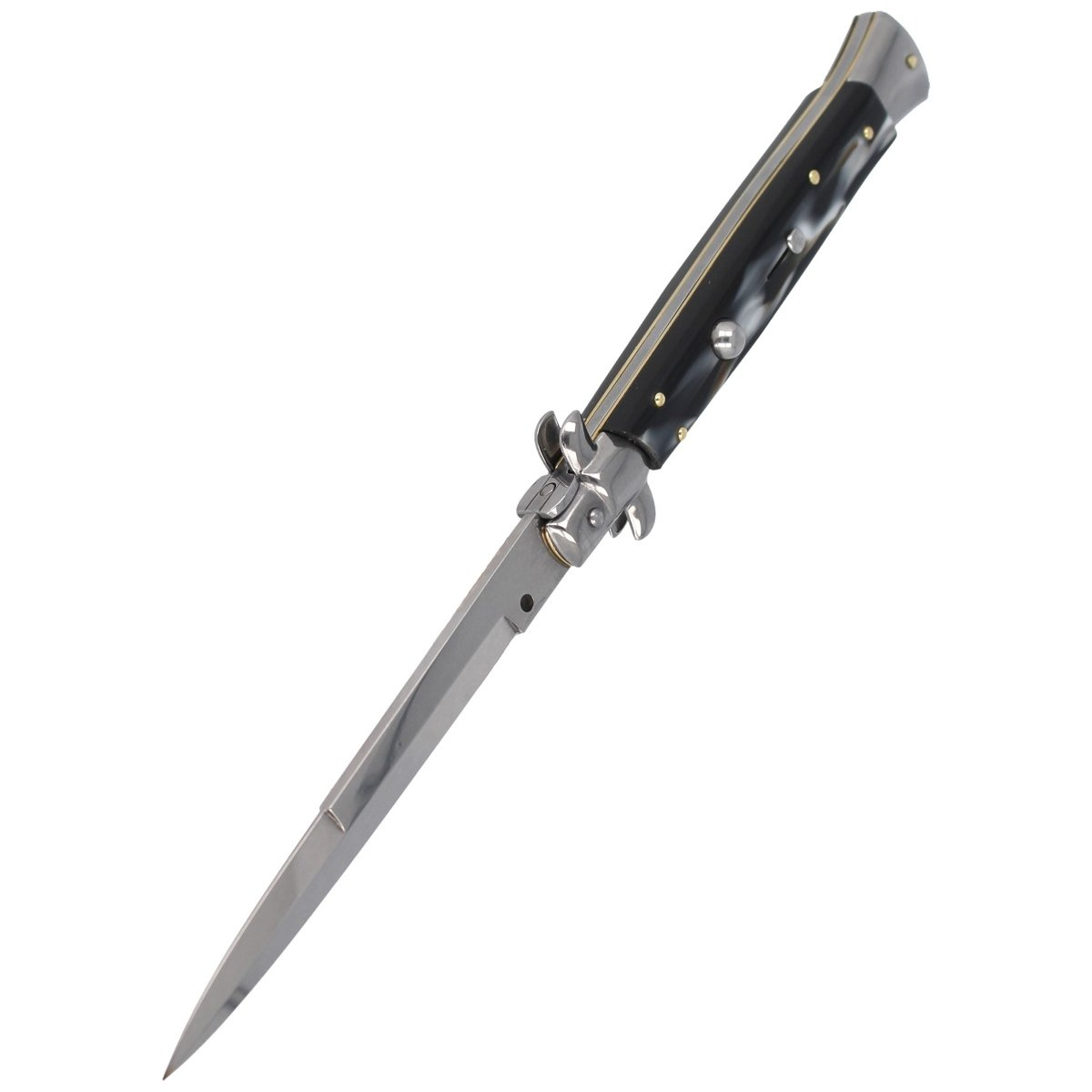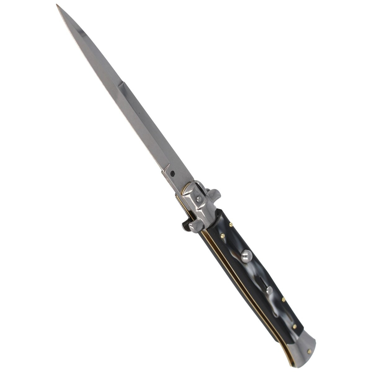 - Frank Beltrame Stiletto Imit. Horn Bayonet 28cm. Kultowy włoski nóż sprężynowy ręcznie składany okładziny imitujące róg bawoła. Folder podczas otwierania klingi setnych sekundy wydaje charakterystyczny klik odróżniający go od pozostałych noży sprężynowych