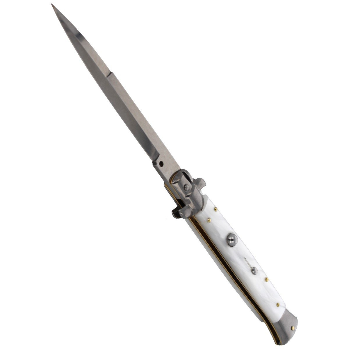 - Frank Beltrame Stiletto Bayonet White Pearl 28 cm. Ręcznie składany według zasad włoskiego rzemiosła, tradycyjny włoski nóż sprężynowy. Folder podczas otwierania klingi wydaję charakterystyczny dźwięk klik odróżniający go od pozostałych noży sprężynowych.